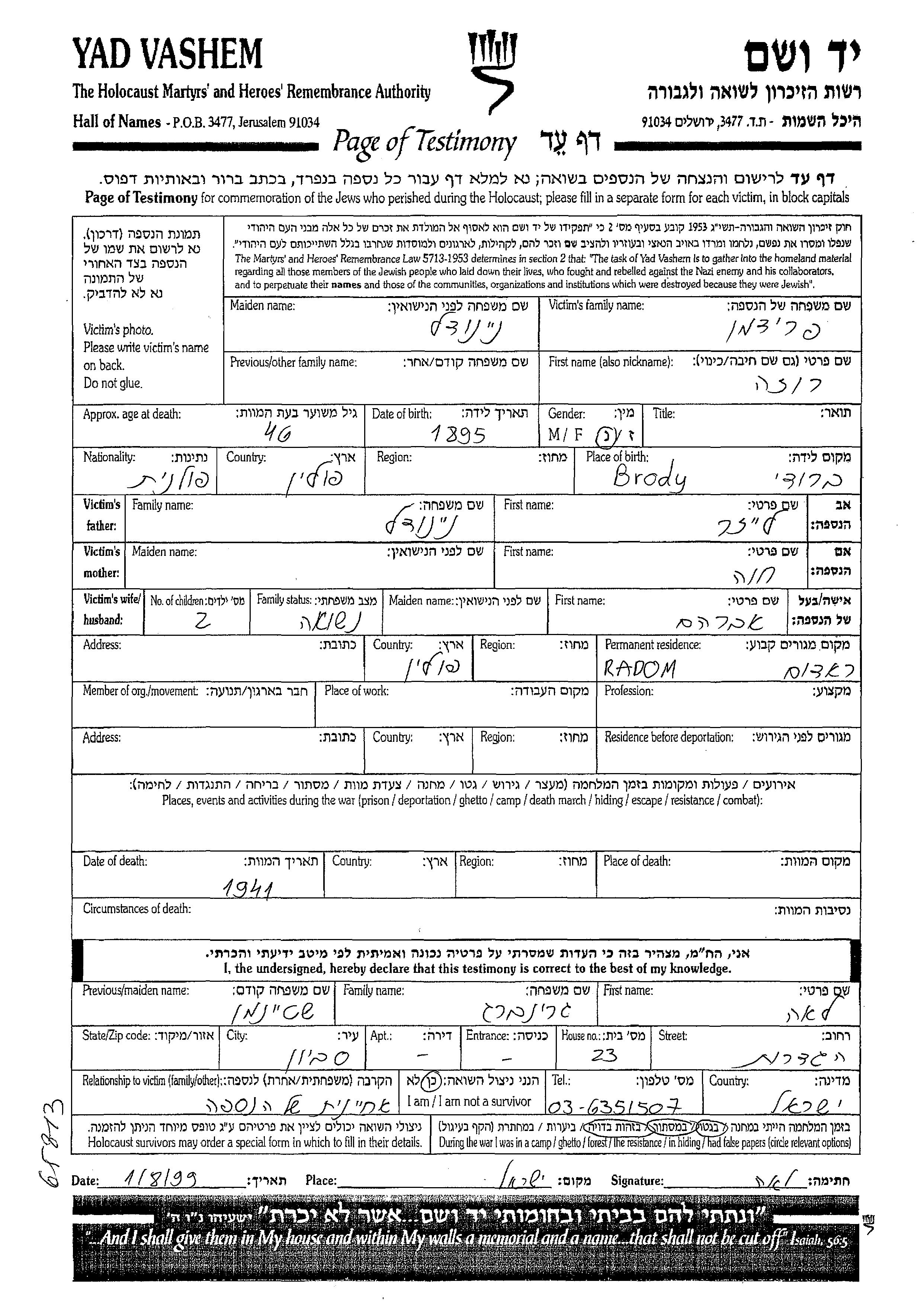 Roza Fridman nee Neinudel was born in Brody, Poland, 1895 to Leizer and Khava. She was married to Avraham. Prior to WWII she lived in Radom, Poland. Roza was murdered in the Shoah. Place of death: unknown, 1941.