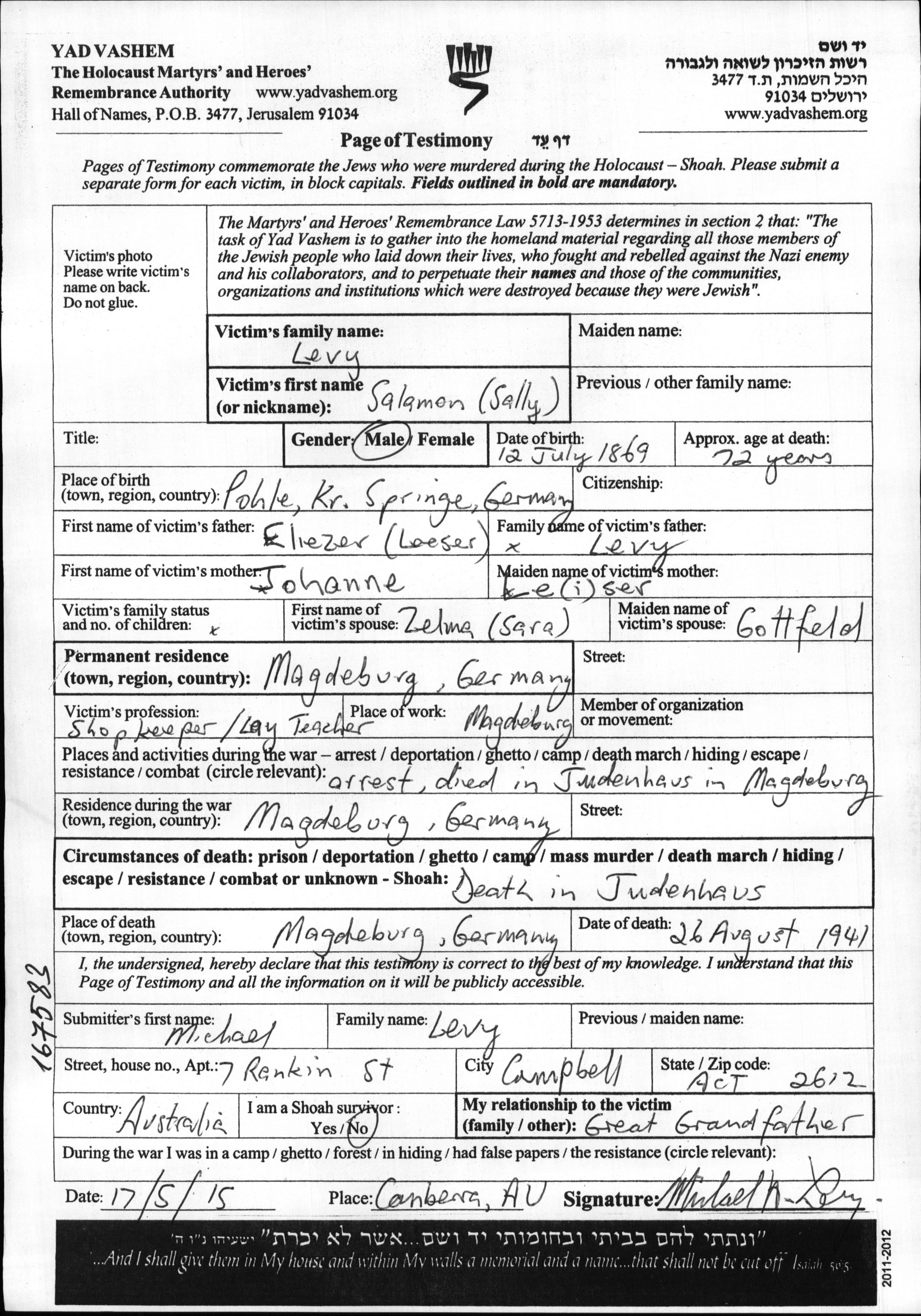 Salamon Levy was born in Pohle, Germany, 1869 to Eliezer and Johanne nee Leiser. He was a shoe merchant and married to Zelma Sara nee Gottfeld. Prior to WWII he lived in Magdeburg, Germany. During the war he was in Magdeburg, Germany. Salamon was murdered in the Shoah. Place of death: Magdeburg, Germany, 26/08/1941.