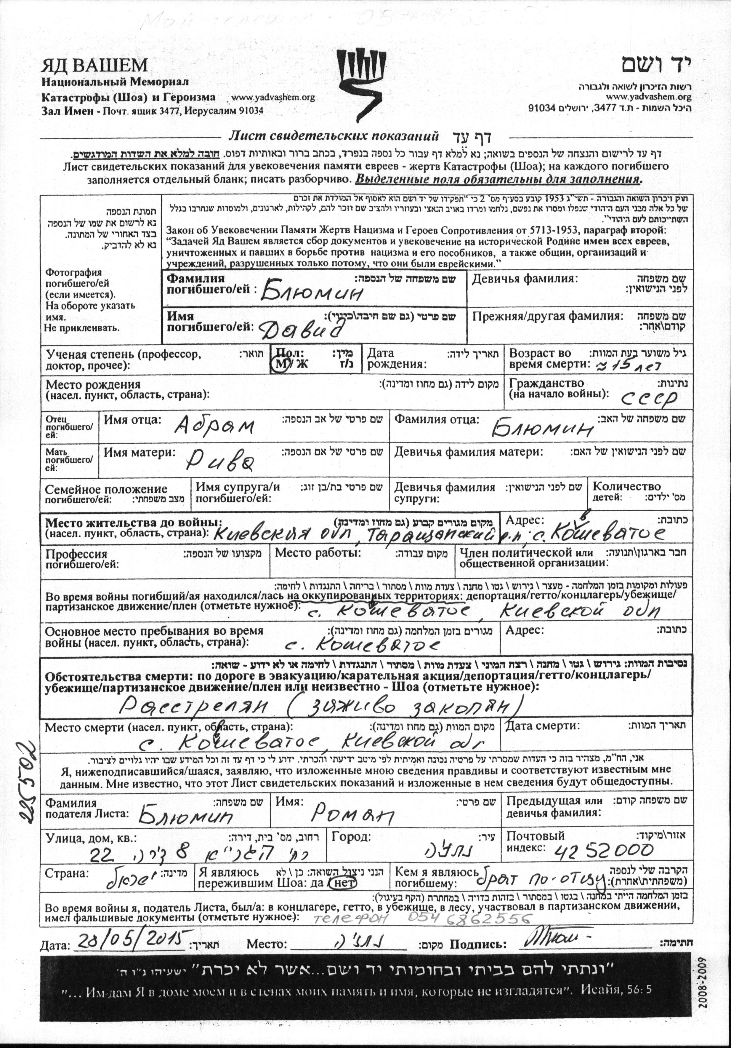 Blyumin David Koshevatoye, Ukraine (USSR) Page of Testimony