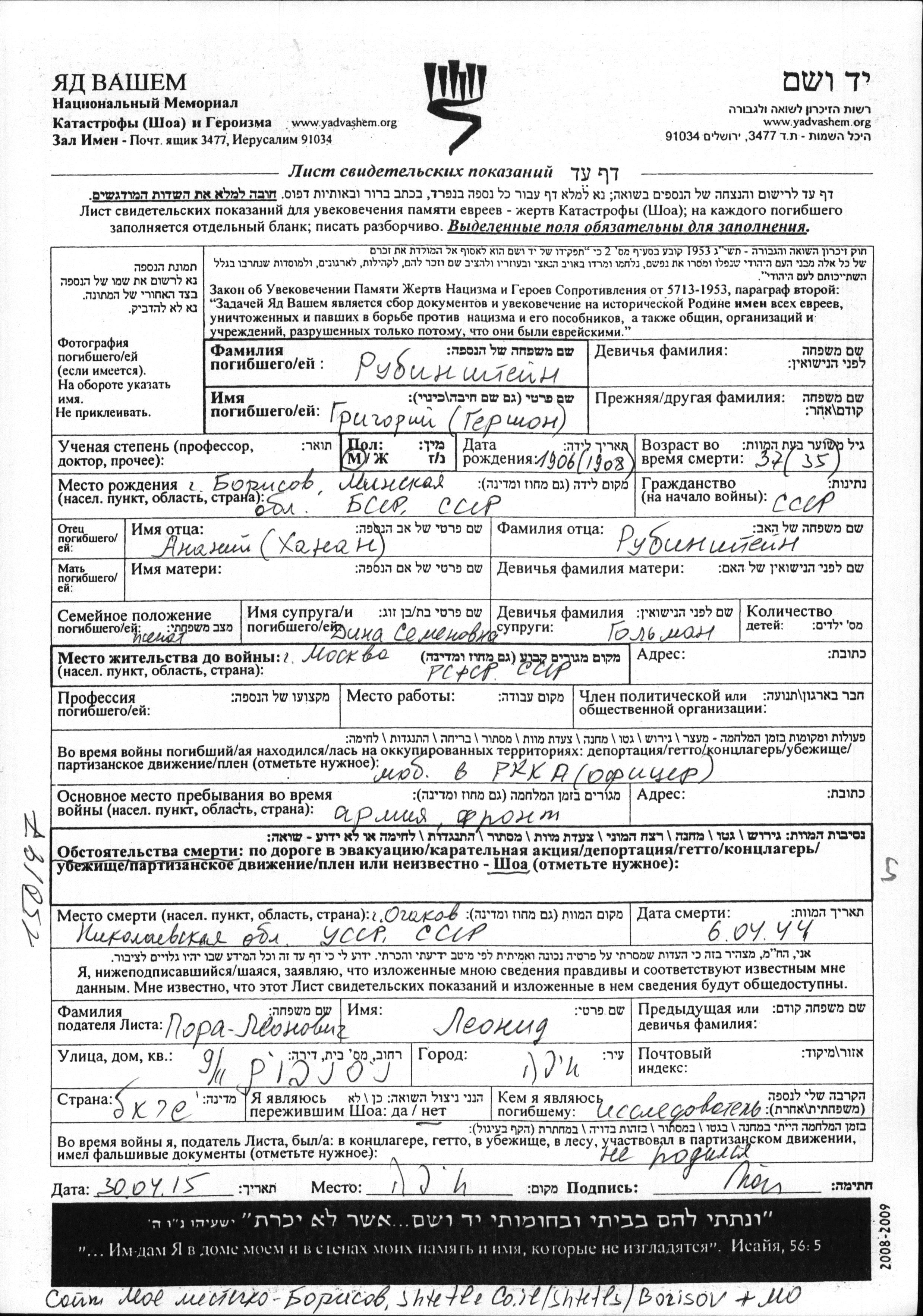 Grigoriy Gershon Rubinshteyn was born in Borisov, Belorussia (USSR), 1906 to Ananiy Khanan. He was married to Dina nee Golman. Prior to WWII he lived in Moskva, Russia (USSR). During the war he was in the Soviet armed forces. Grigoriy Gershon was killed in military service in WWII. Place of death: Ochakov, Ukraine (USSR), 06/04/1944.