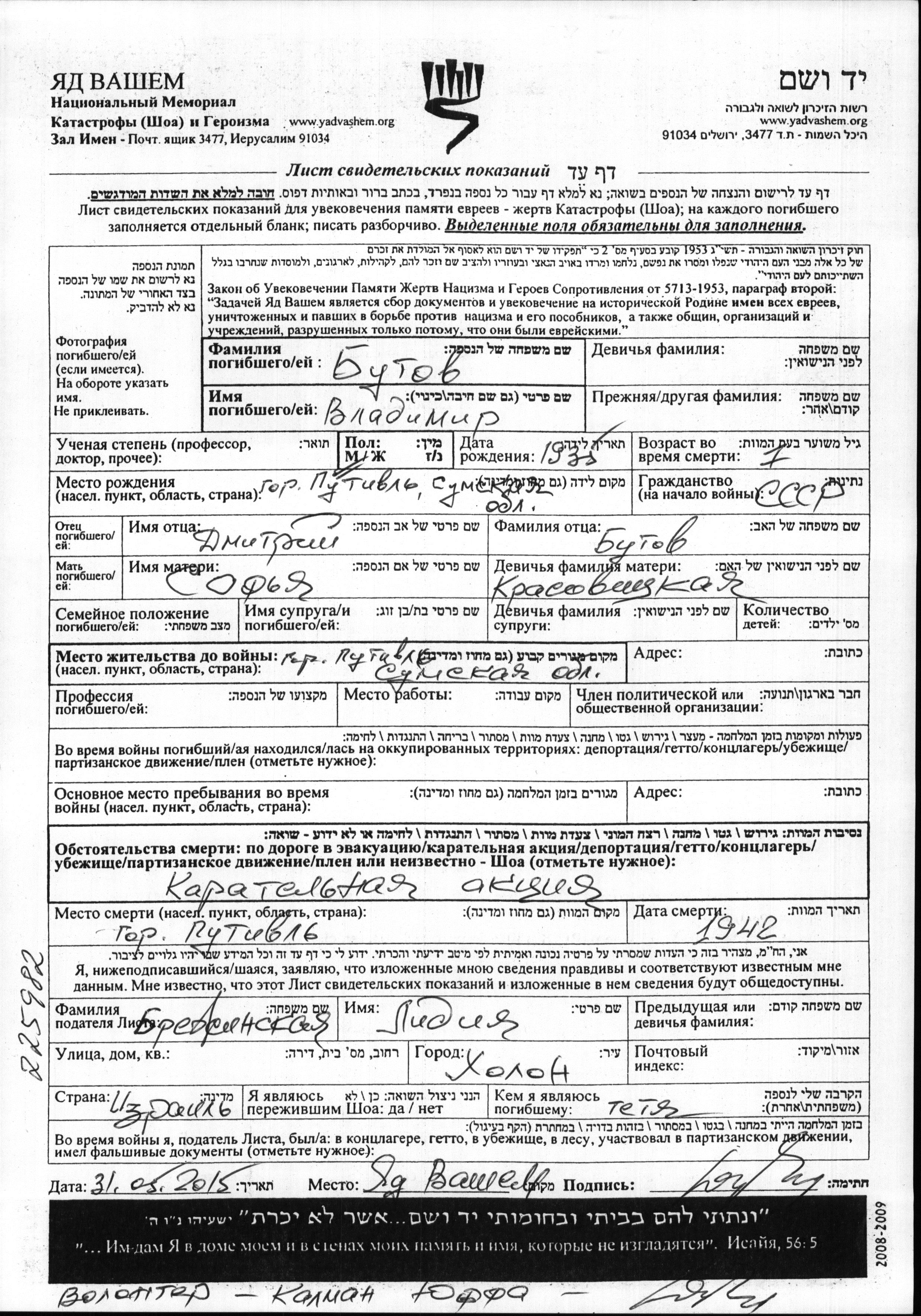 Vladimir Butov was born in Putivl, Ukraine (USSR), 1935 to Dmitriy and Sofya nee Krasovitzkaya. He was child. Prior to WWII he lived in Putivl, Ukraine (USSR). Vladimir was murdered in the Shoah. Place of death: Putivl, Ukraine (USSR), 1942.