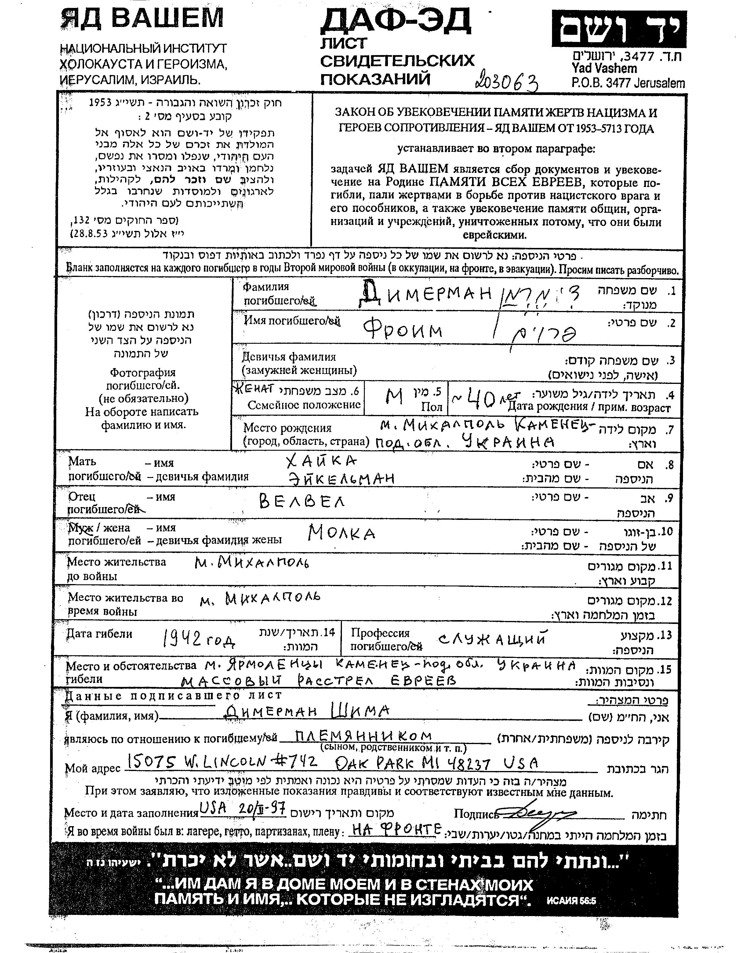 Froim Dimerman was born in Mikhalpol, Ukraine (USSR), 1902 to Velvel and Khaika. He was a clerk and married to Molka. Prior to WWII he lived in Mikhalpol, Ukraine (USSR). During the war he was in Mikhalpol, Ukraine (USSR). Froim was murdered in the Shoah. Place of death: Yarmolintsy, Ukraine (USSR), 1942.