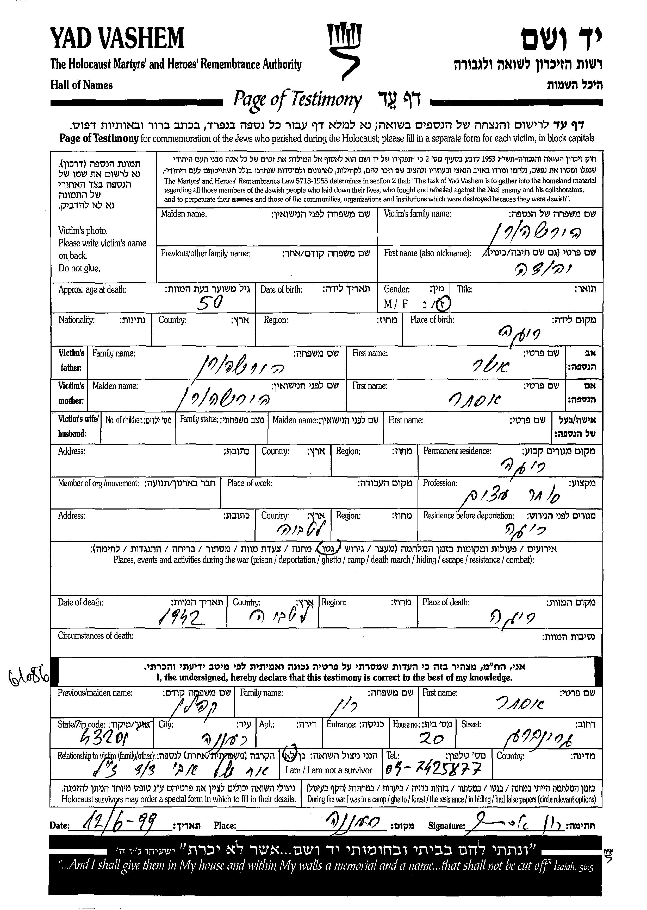 Yehuda Hirshhorn was born in Riga, Latvia to Asher and Ester. He was a wood merchant. Prior to WWII he lived in Riga, Latvia. During the war he was in Riga, Latvia. Yehuda was murdered in the Shoah. Place of death: Riga, Latvia, 1942.