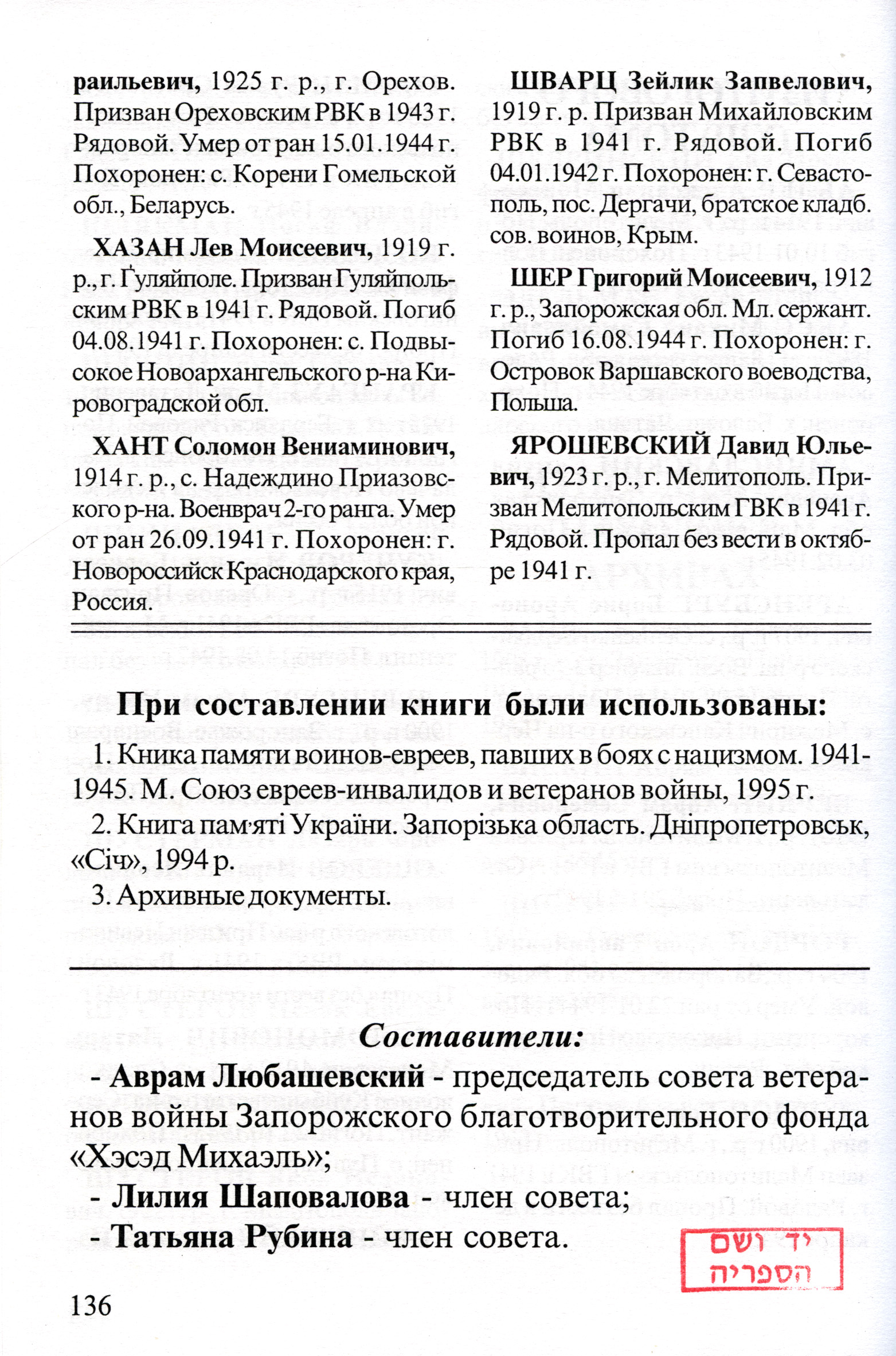 Private Lev Khazan was born in Gulyaypole, Ukraine (USSR), 1919 to Moisey. Prior to WWII he lived in Gulyaypole, Ukraine (USSR). During the war he was in the Soviet armed forces. Private Khazan was killed in military service in WWII. Place of death: unknown, 04/08/1941.