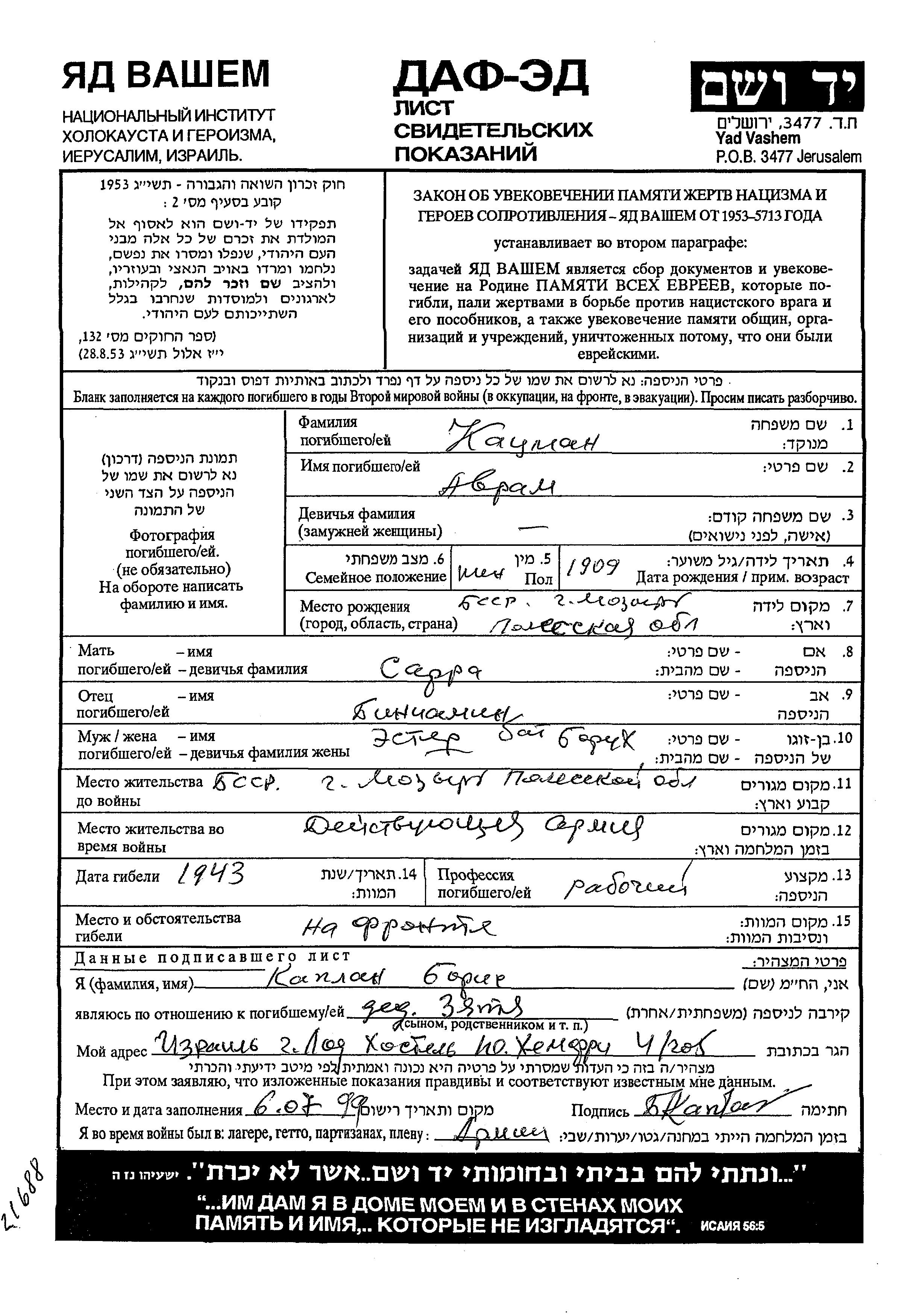 Katzman Abram 1909 Mozyr, Belorussia (USSR) Page of Testimony