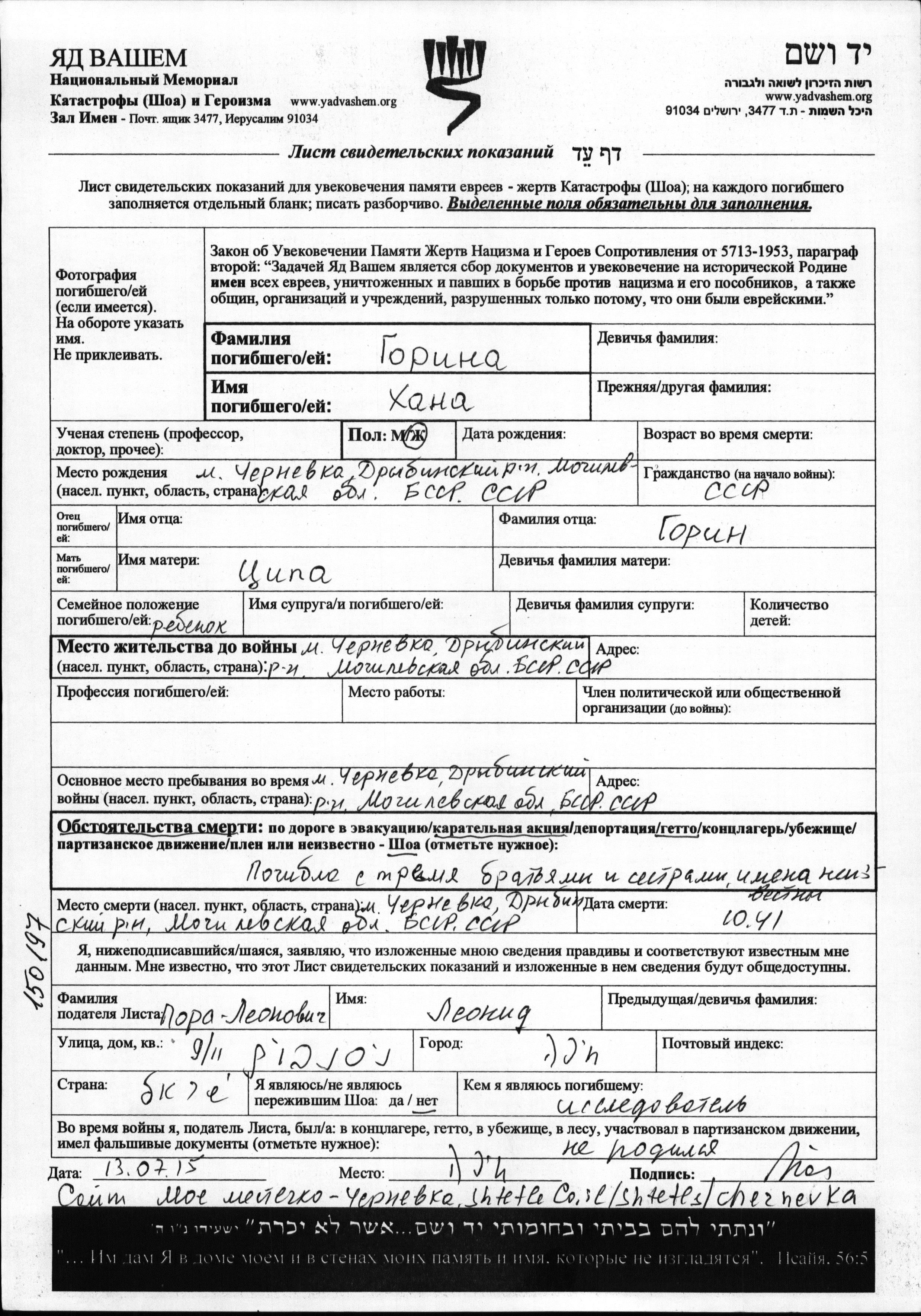 Khana Gorina was born in Chernevka, Belorussia (USSR) to Tzipa. She was child. Prior to WWII she lived in Chernevka, Belorussia (USSR). During the war she was in Chernevka, Belorussia (USSR). Khana was murdered in the Shoah. Place of death: Chernevka, Belorussia (USSR), 10/1941.