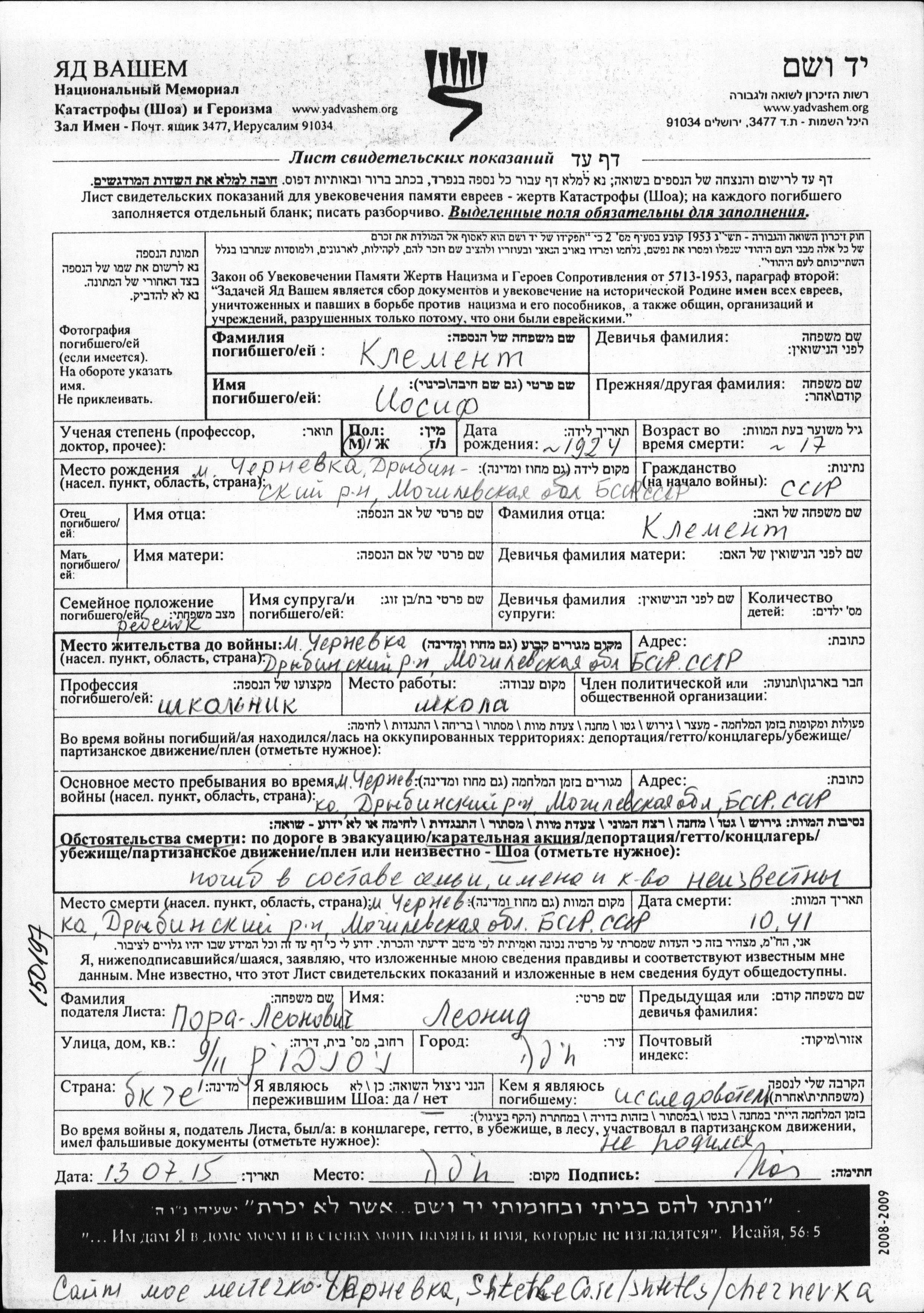 Iosif Klement was born in Chernevka, Belorussia (USSR), 1924. He was a schoolboy and teenager. Prior to WWII he lived in Chernevka, Belorussia (USSR). During the war he was in Chernevka, Belorussia (USSR). Iosif was murdered in the Shoah. Place of death: Chernevka, Belorussia (USSR), 10/1941.