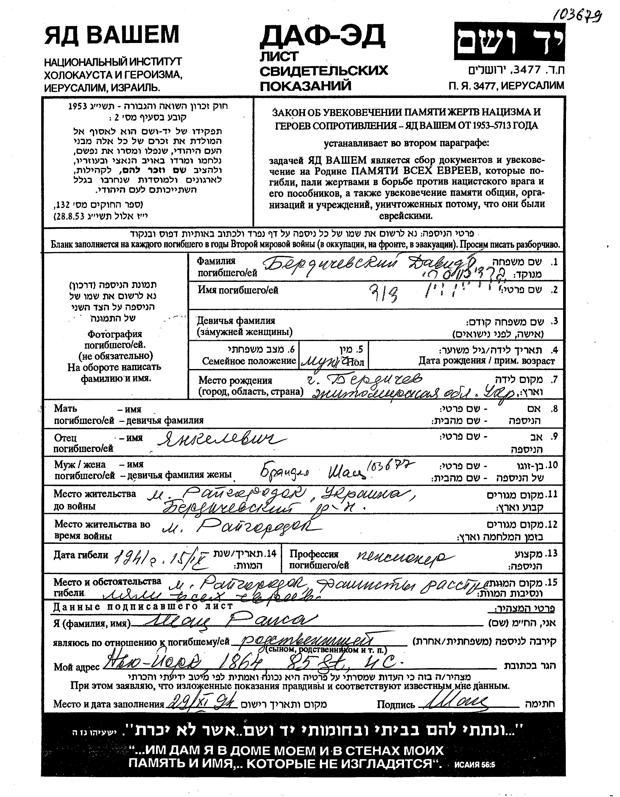 David Berdichevski was born in Berdichev, Ukraine (USSR) to Yankel. He was a pensioner and married to Brandlia. Prior to WWII he lived in Raigorodok, Ukraine (USSR). During the war he was in Raigorodok, Ukraine (USSR). David was murdered in the Shoah. Place of death: Raigorodok, Ukraine (USSR), 15/09/1941.