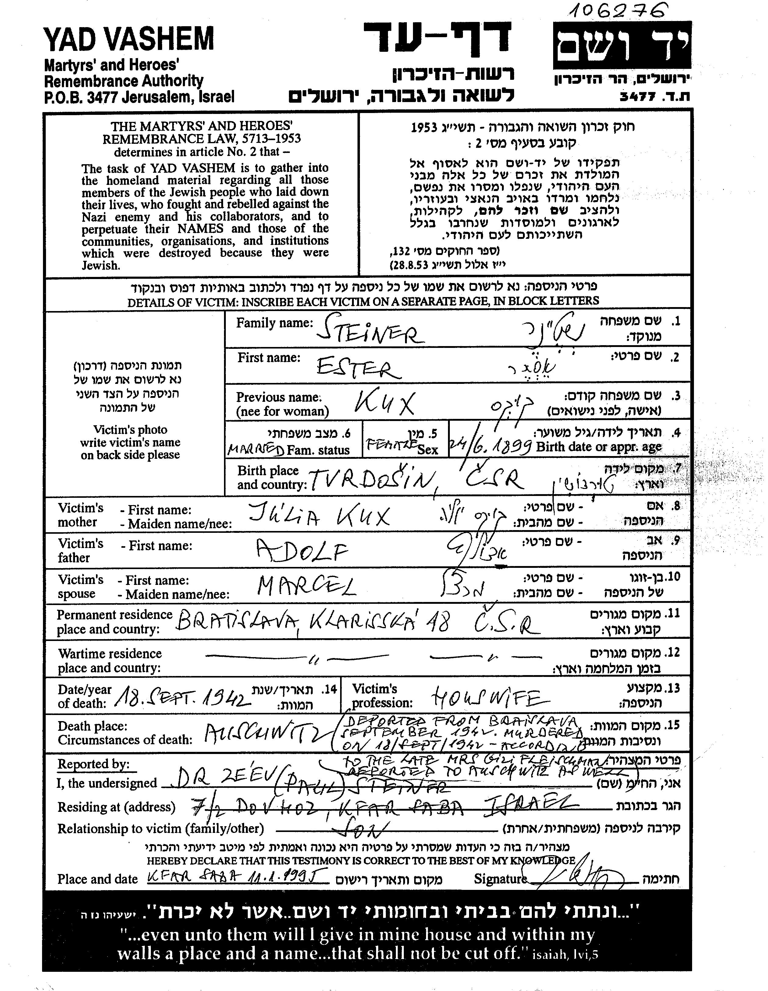 Steiner Ester 1899 Bratislava, Czechoslovakia Page of Testimony