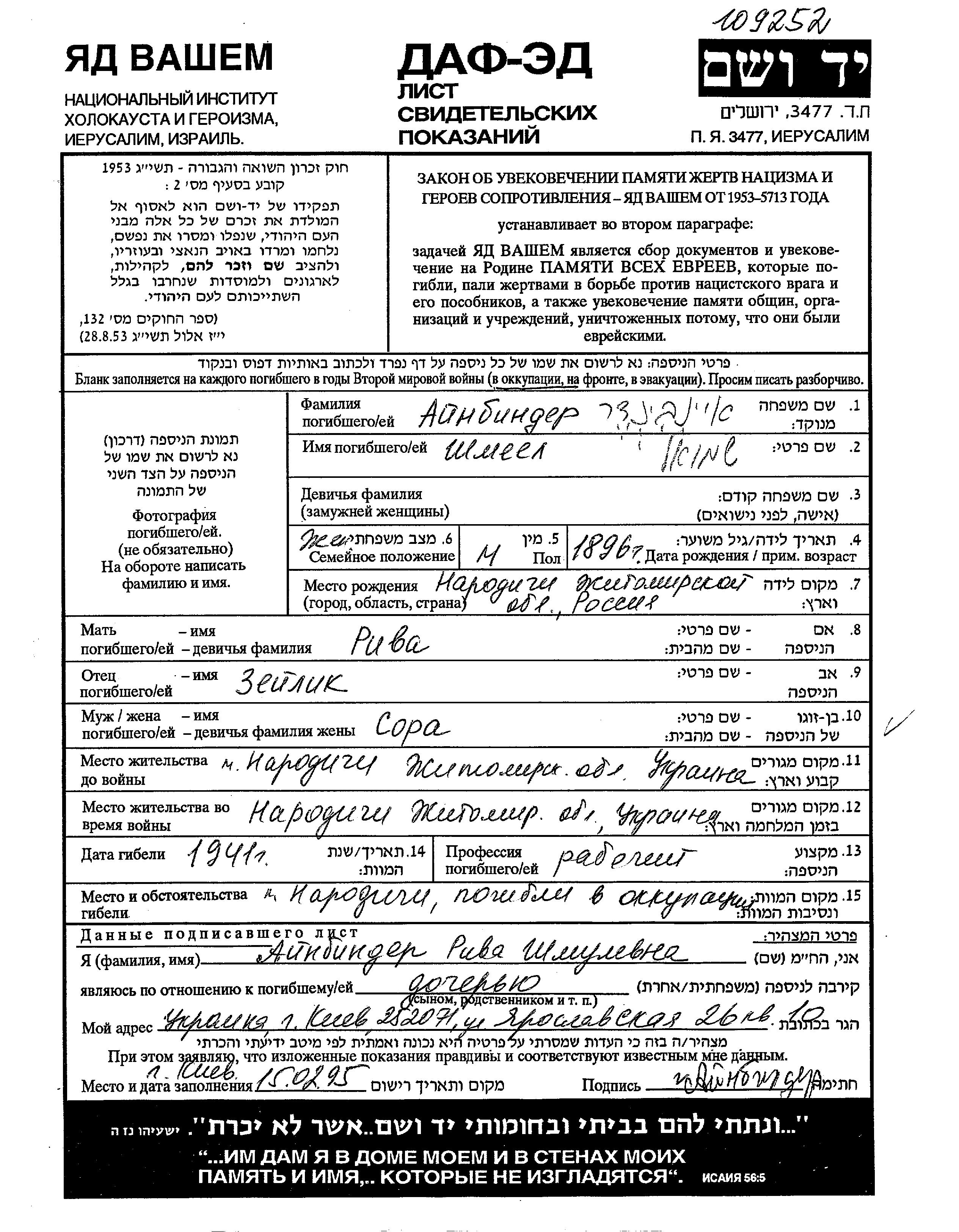 Aibinder Shmeel 1896 Narodichi, Ukraine (USSR) Page of Testimony