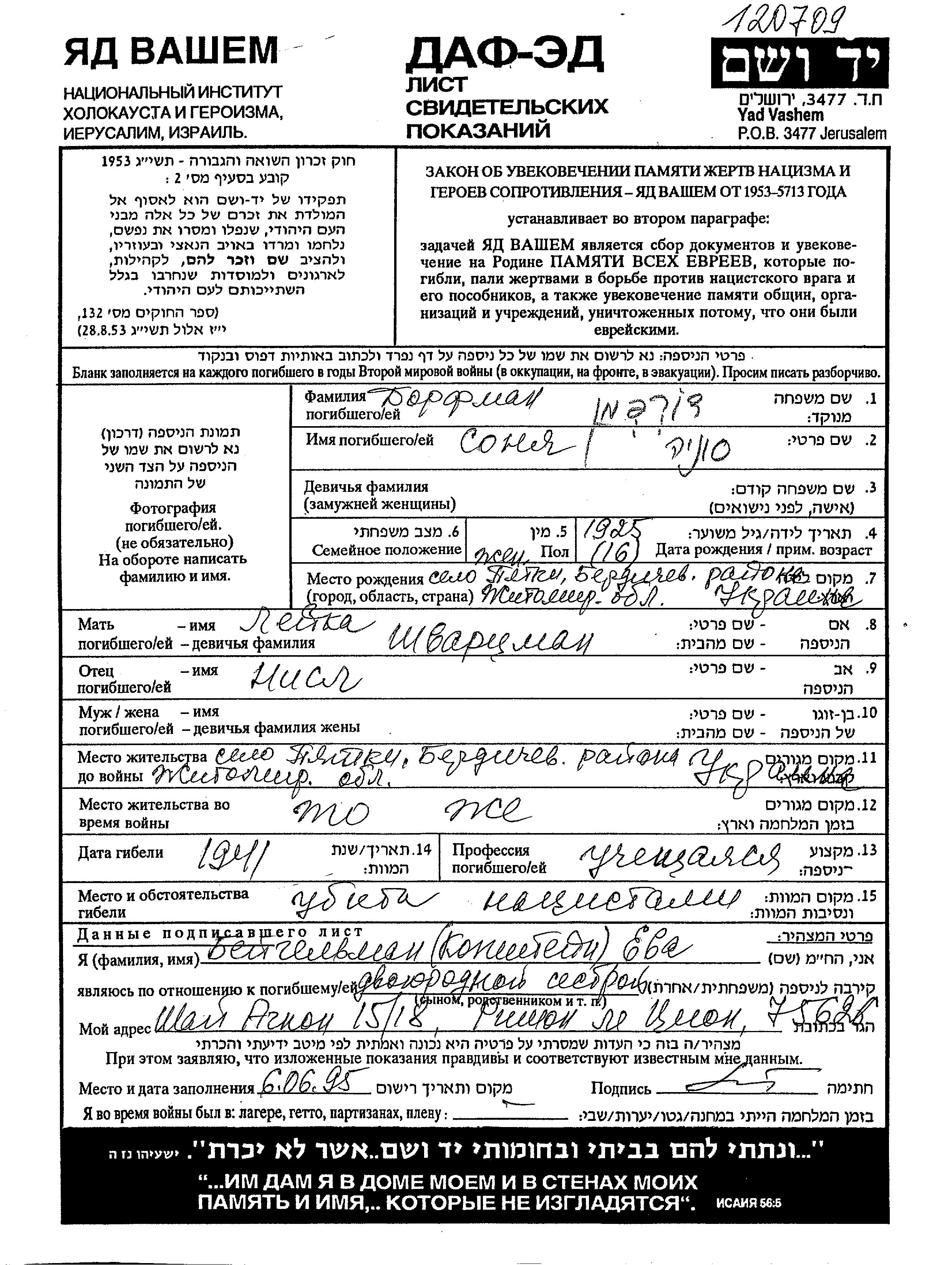 Sonia Dorfman was born in Pyatka, Ukraine (USSR), 1925 to Nisel and Leika nee Shvartzman. She was a pupil and child. Prior to WWII she lived in Pyatka, Ukraine (USSR). During the war she was in Pyatka, Ukraine (USSR). Sonia was murdered in the Shoah. Place of death: Pyatka, Ukraine (USSR), 1941.