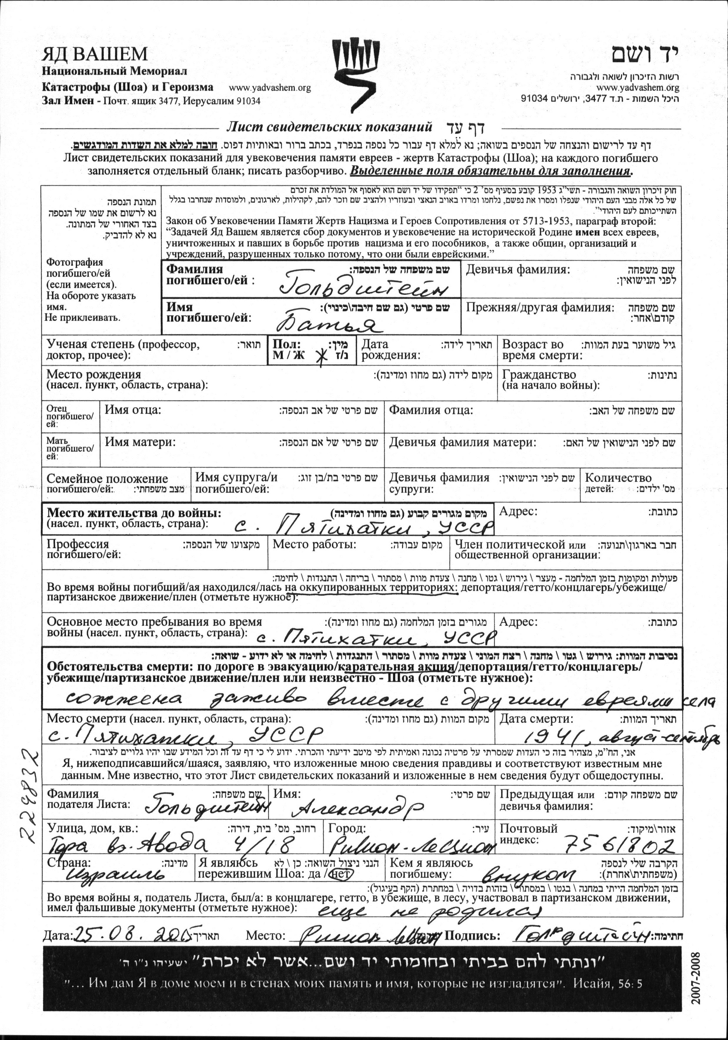 Batia Goldshtein. Prior to WWII she lived in Pyatikhatki, Ukraine (USSR). During the war she was in Pyatikhatki, Ukraine (USSR). Batia was murdered in the Shoah. Place of death: Pyatikhatki, Ukraine (USSR), 08/1941.