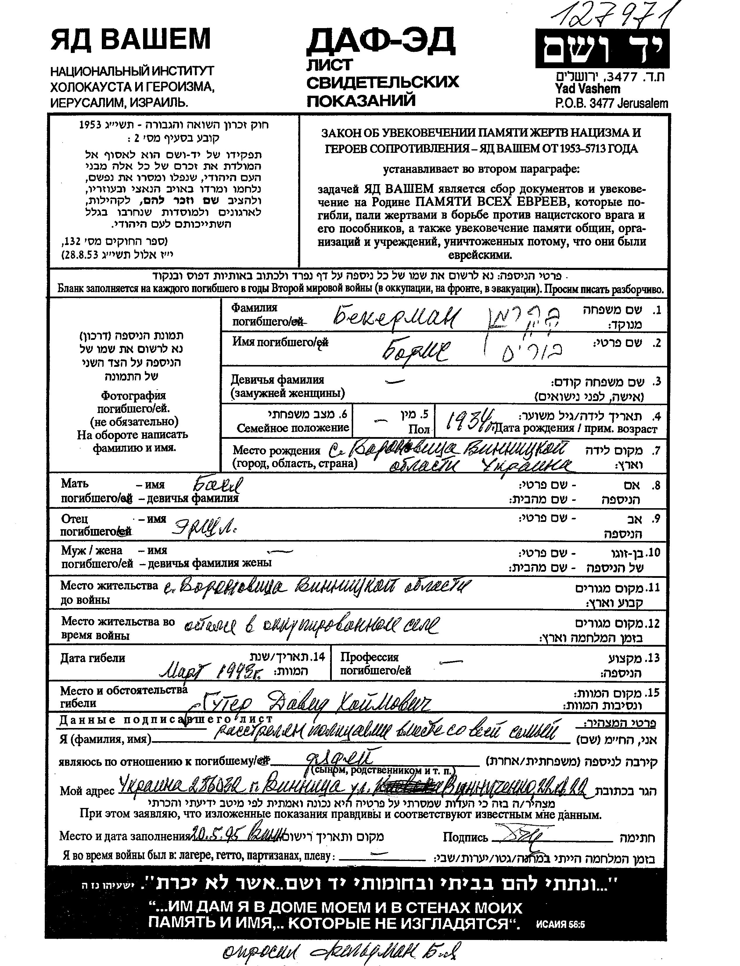 Boris Bekerman was born in Voronovitsa, Ukraine (USSR), 1934 to Ershl and Basia. He was child. Prior to WWII he lived in Voronovitsa, Ukraine (USSR). During the war he was in Voronovitsa, Ukraine (USSR). Boris was murdered in the Shoah. Place of death: Voronovitsa, Ukraine (USSR), 1943.