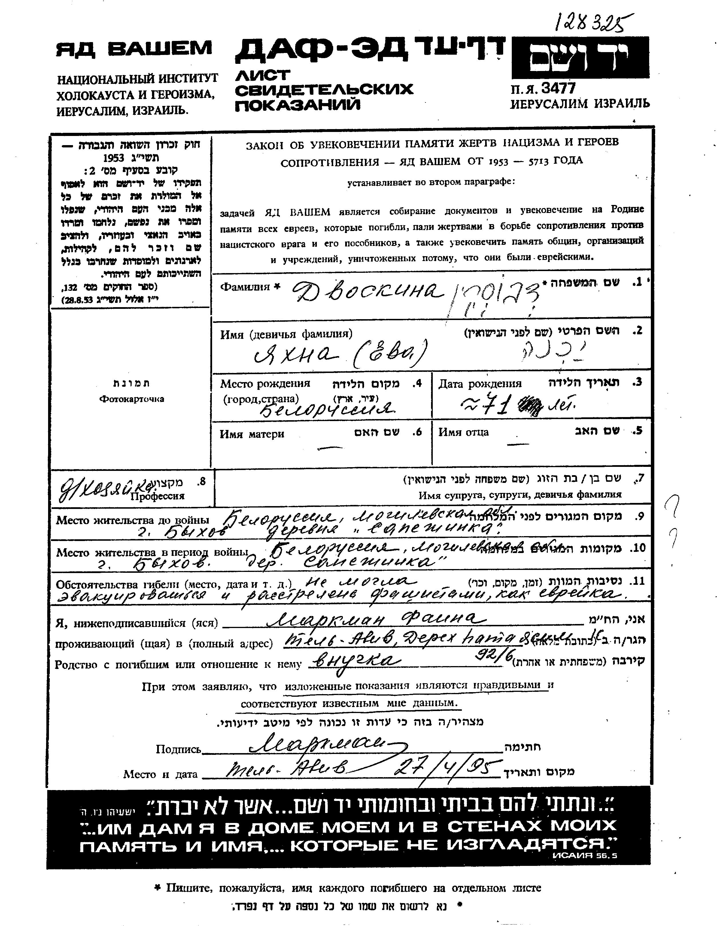 Yakhna Yeva Dvoskin was born in Belorussia (USSR). She was a housewife. Prior to WWII she lived in Sapezhinka, Belorussia (USSR). During the war she was in Sapezhinka, Belorussia (USSR). Yakhna Yeva was murdered in the Shoah.