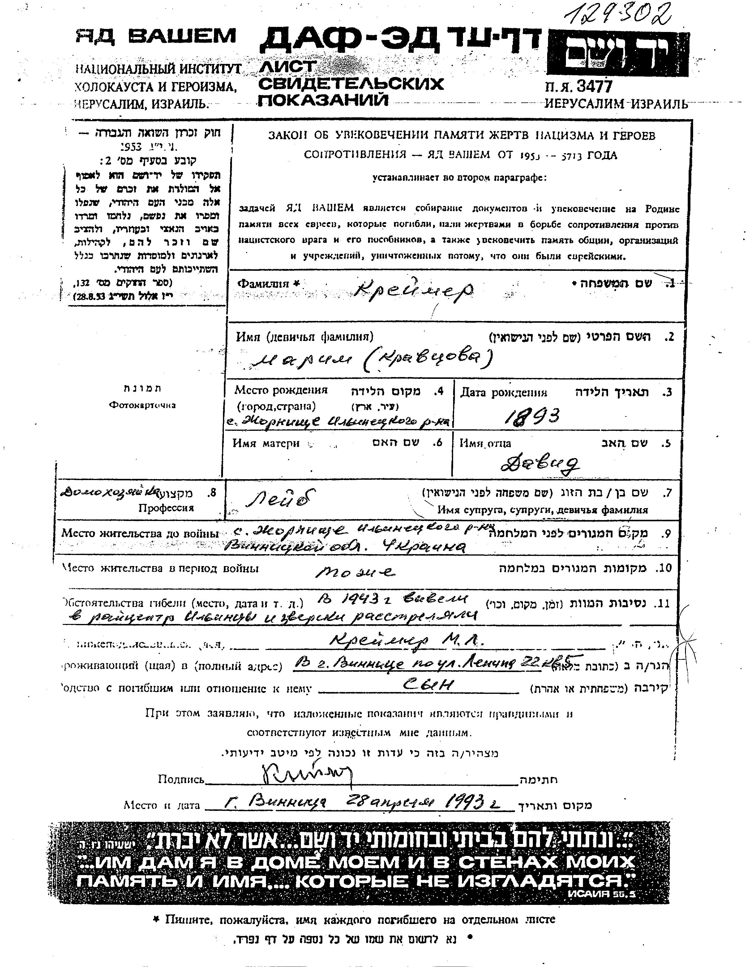 Kreimer Marim 1893 Zhornishche, Ukraine (USSR) Page of Testimony