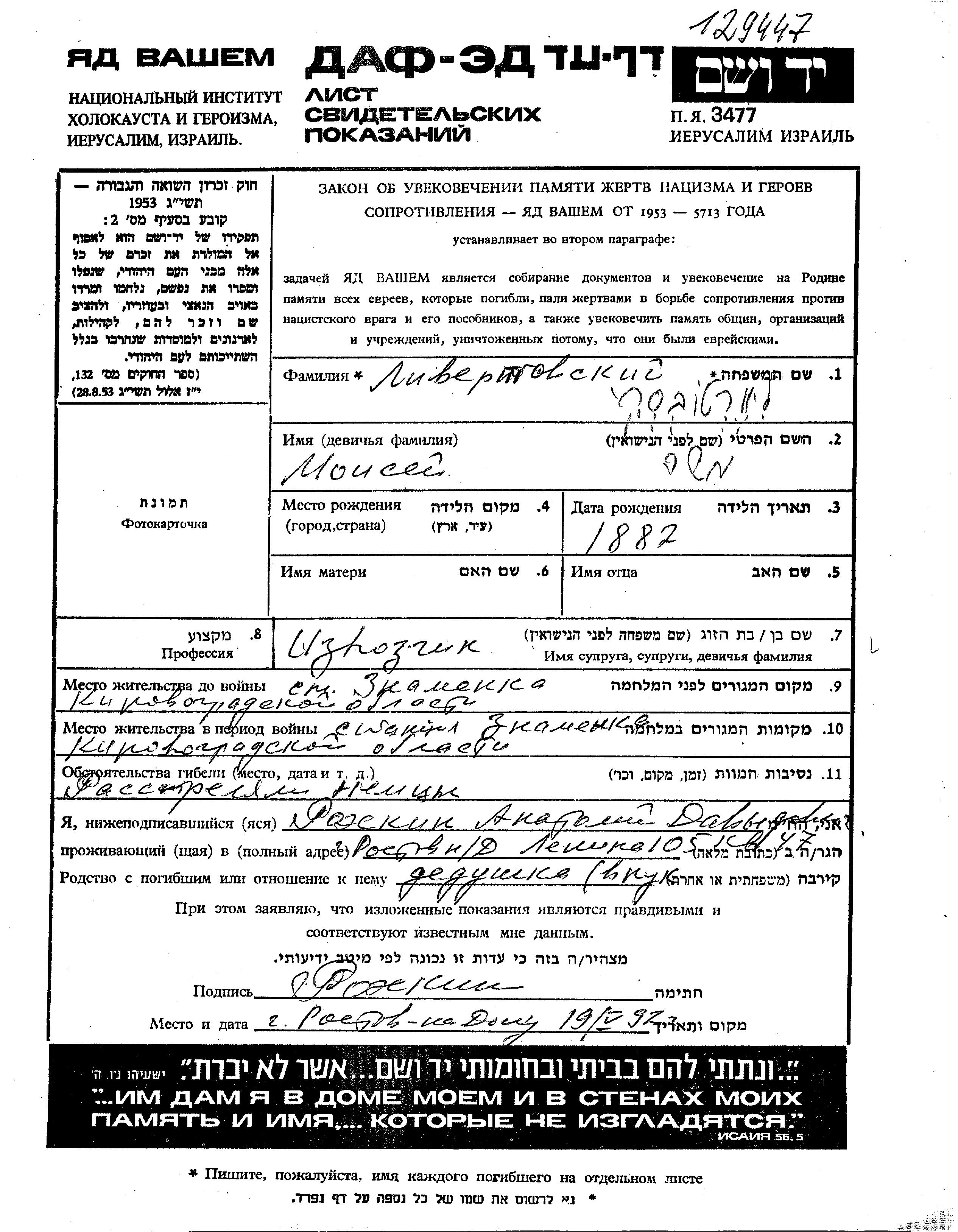 Moisei Livertovski was born, 1882. He was a waggoner. Prior to WWII he lived in Znamenka, Ukraine (USSR). During the war he was in Znamenka, Ukraine (USSR). Moisei was murdered in the Shoah.