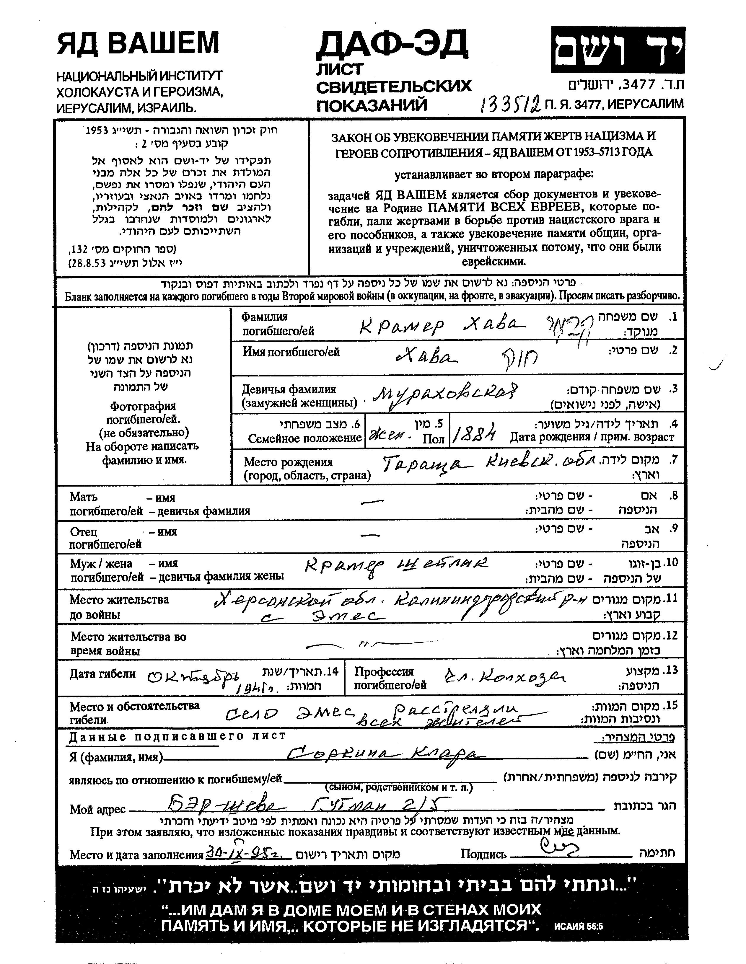 Kramer Khava 1884 Emes, Ukraine (USSR) Page of Testimony