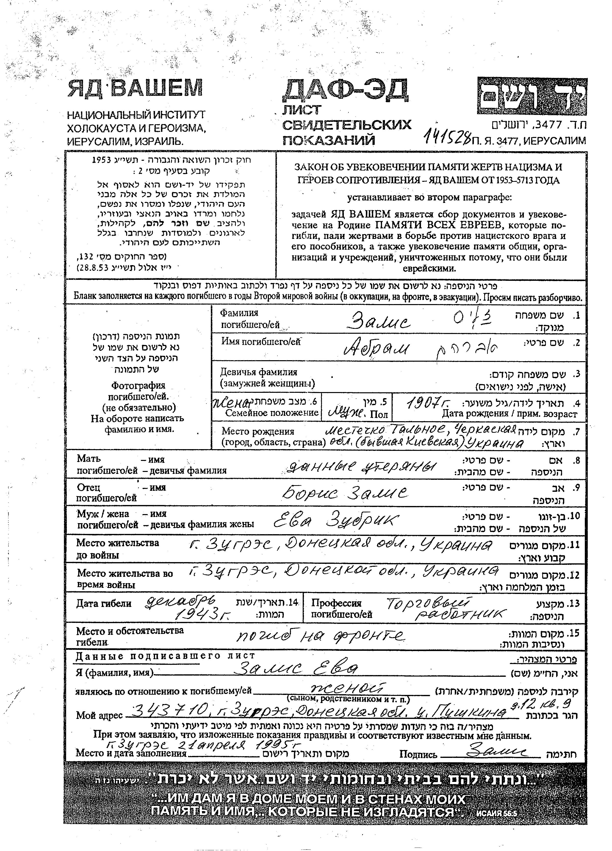 Abram Zalis was born in Talnoye, Ukraine (USSR), 1907 to Boris. He was a sales person and married to Yeva. Prior to WWII he lived in Zugres, Ukraine (USSR). During the war he was in the Soviet armed forces. Abram was killed in military service in WWII. Place of death: unknown, 1943.