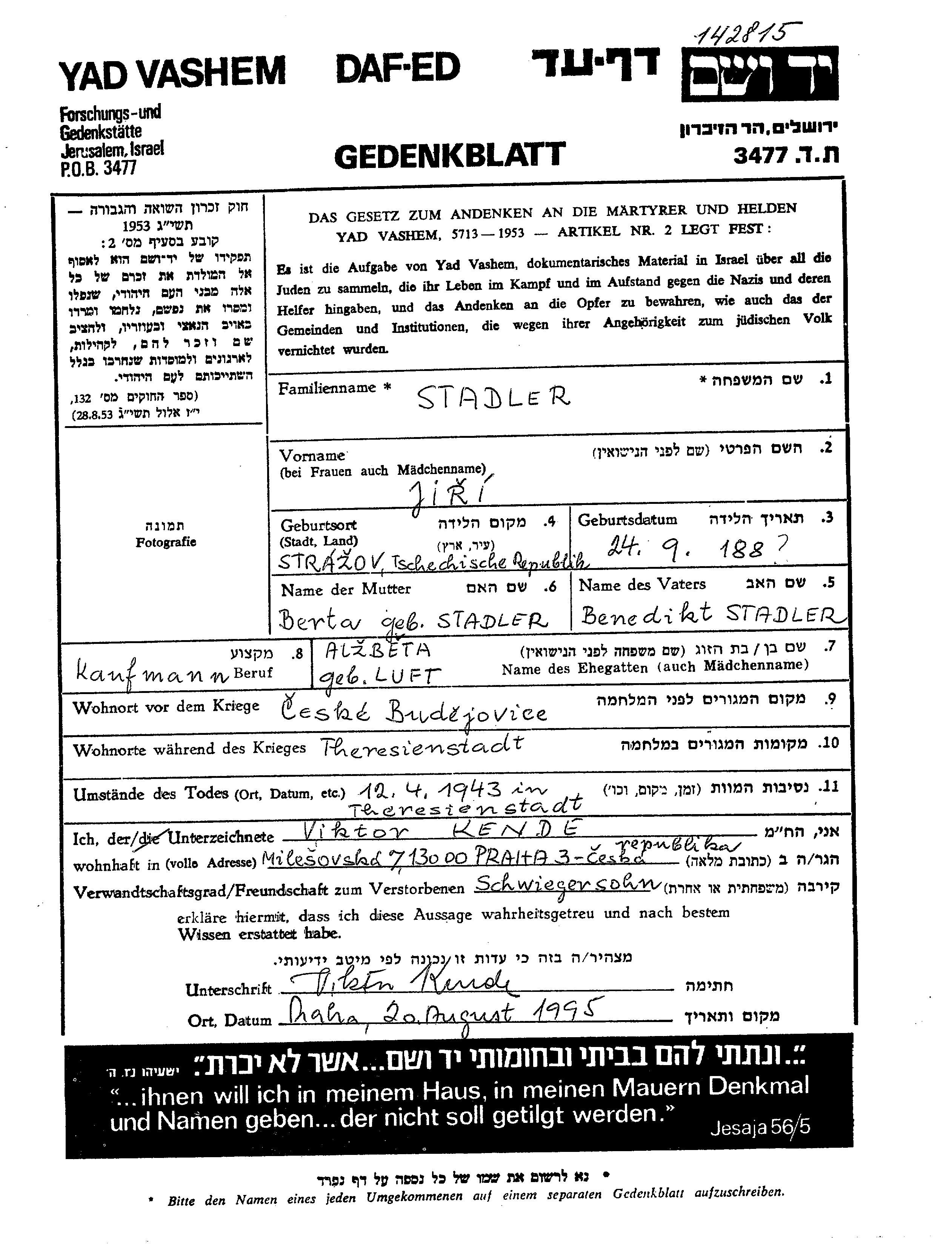 Stadler Jiri Ceske Budejovice, Czechoslovakia Page of Testimony