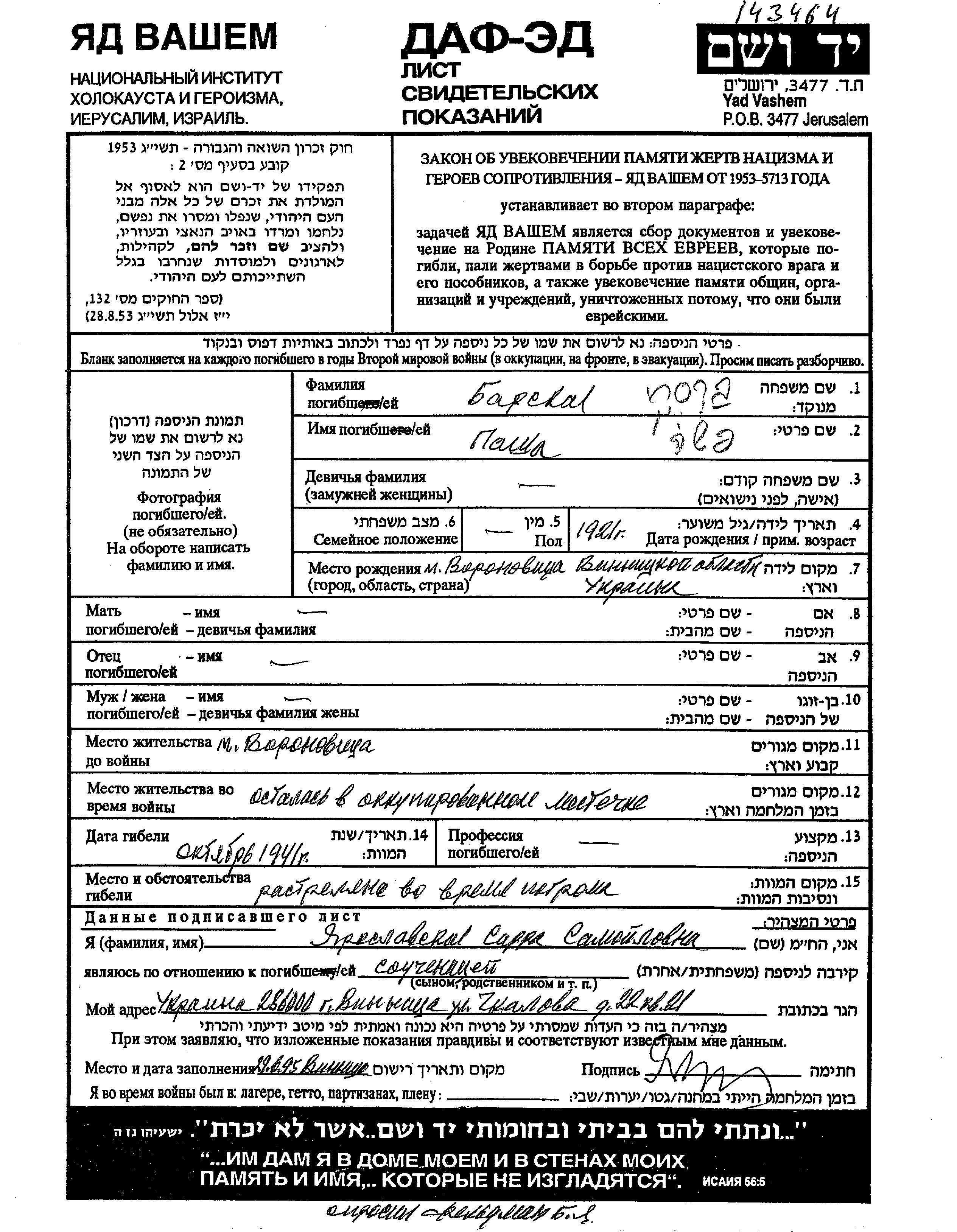 Barski Pasha 1921 Voronovitsa, Ukraine (USSR) Page of Testimony