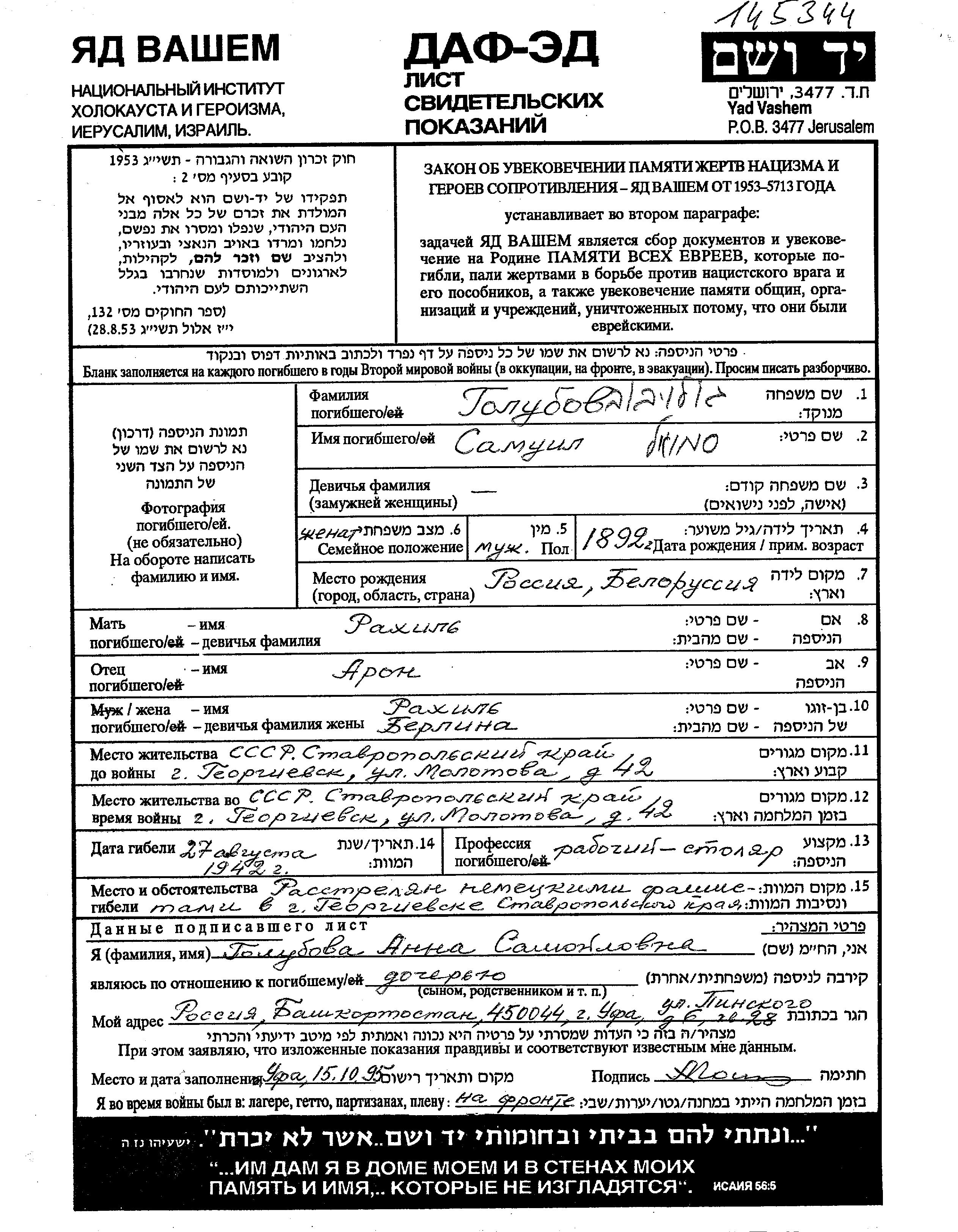 Samuil Golubov was born in Belorussia (USSR), 1892 to Aron and Rakhil. He was a carpenter and married to Rakhil. Prior to WWII he lived in Georgiyevsk, Russia (USSR). During the war he was in Georgiyevsk, Russia (USSR). Samuil was murdered in the Shoah. Place of death: Georgiyevsk, Russia (USSR), 27/08/1942.