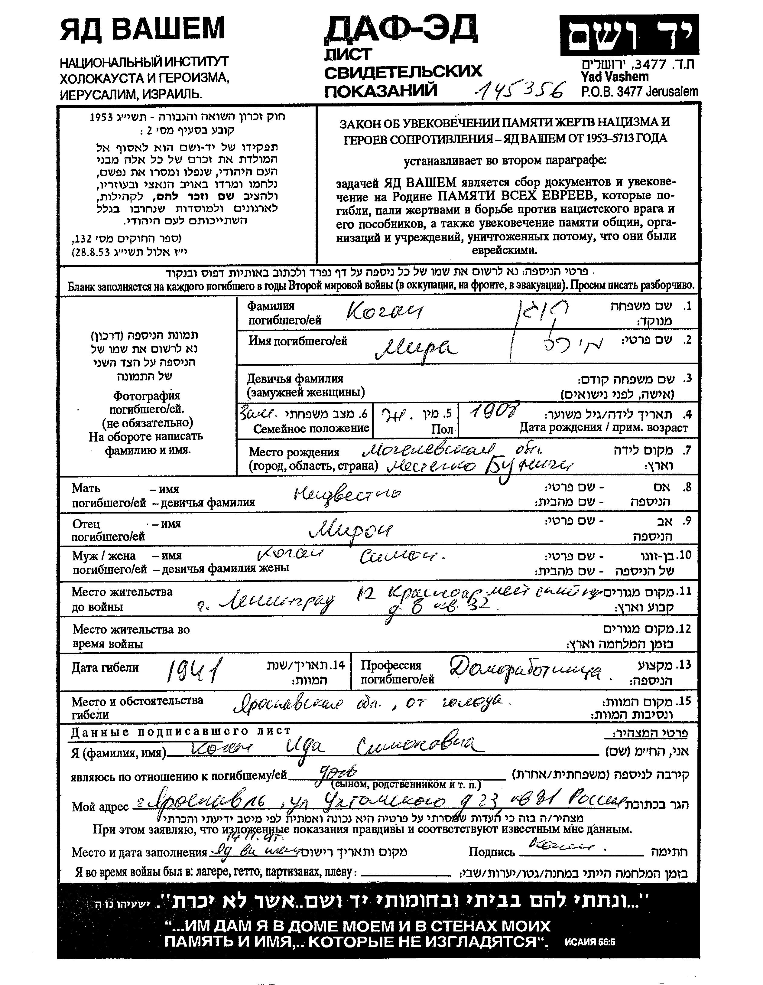 Kogan Mira 1908 Leningrad, Russia (USSR) Page of Testimony