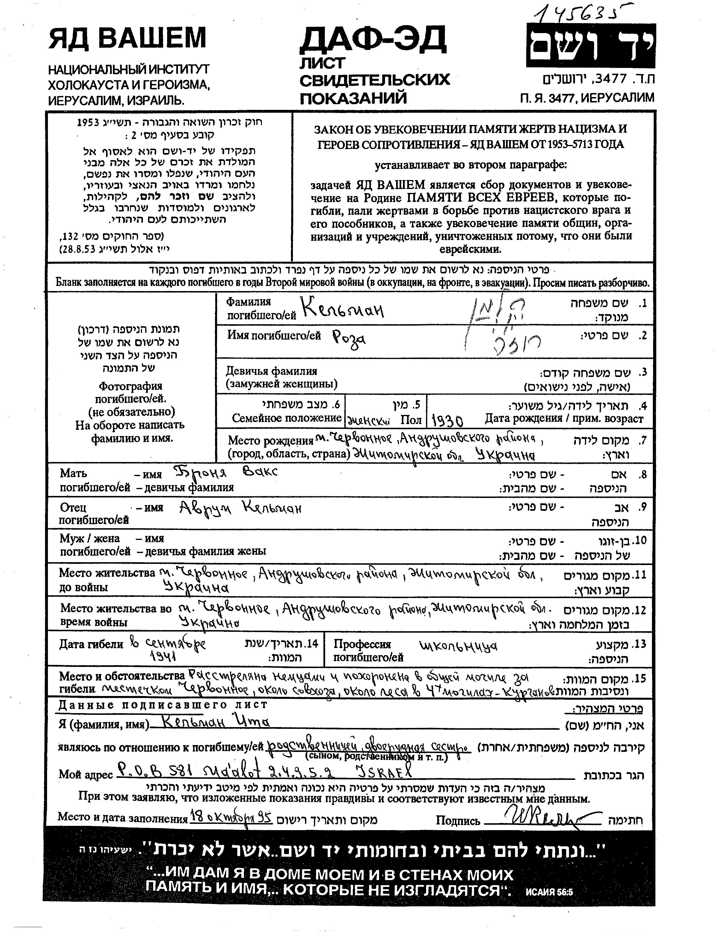 Roza Kelman Kalman was born in Chervonoye, Ukraine (USSR), 1930 to Avrum and Bronia nee Vaks. She was a pupil and child. Prior to WWII she lived in Chervonoye, Ukraine (USSR). During the war she was in Chervonoye, Ukraine (USSR). Roza was murdered in the Shoah. Place of death: Chervonoye, Ukraine (USSR), 1941.
