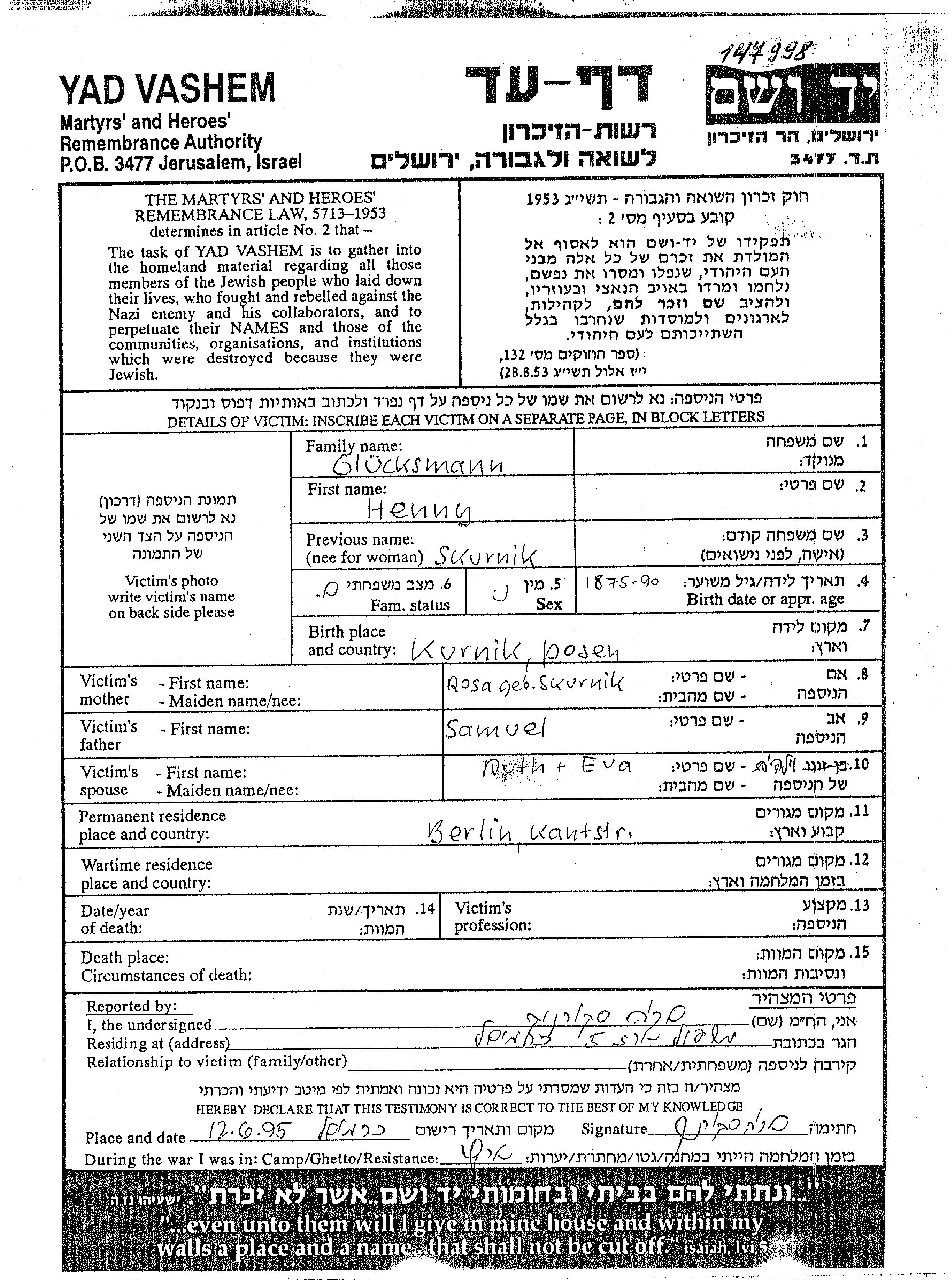 Gluecksmann Ruth Berlin, Germany Page of Testimony