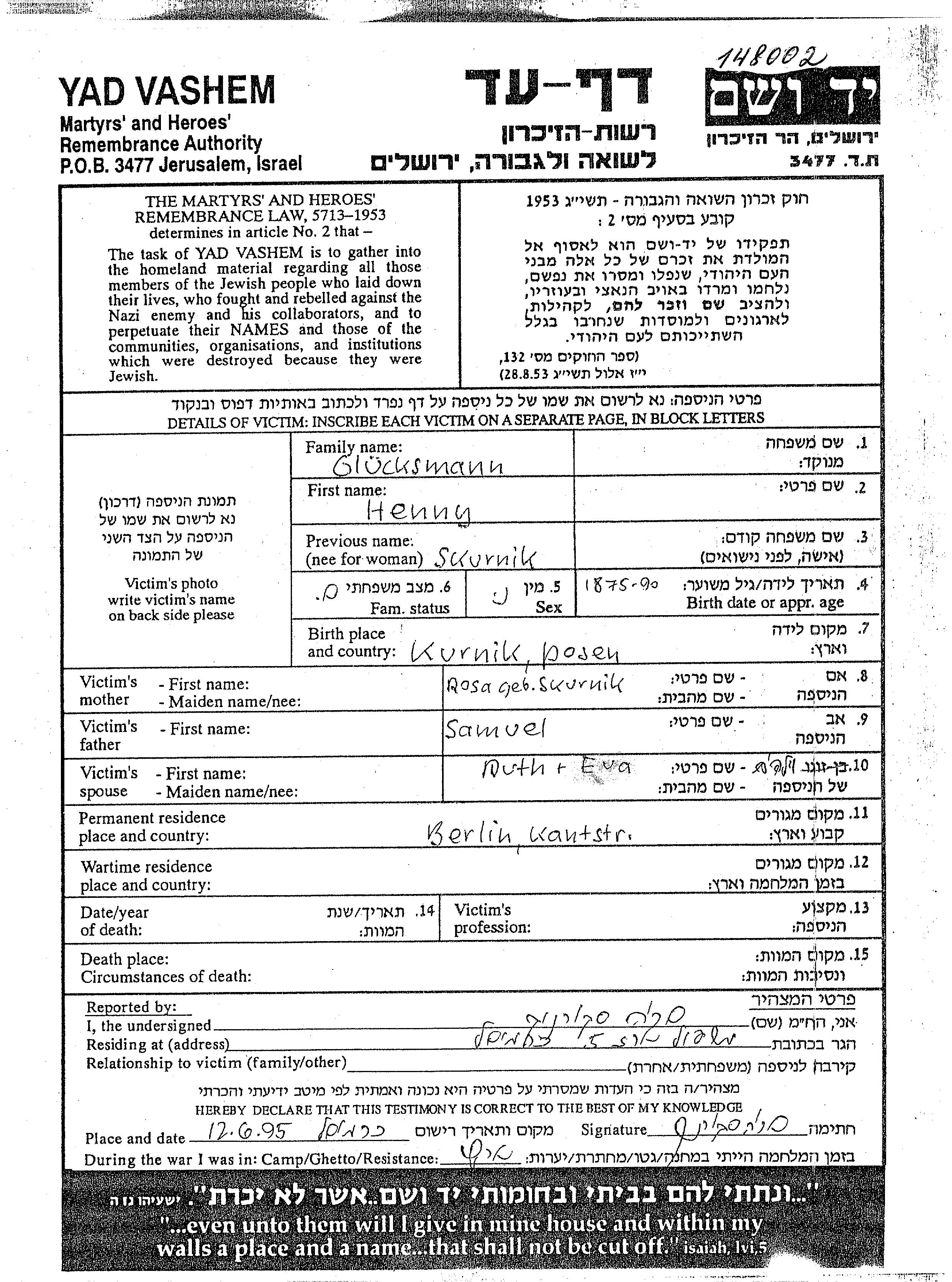 Gluecksmann Eva Berlin, Germany Page of Testimony