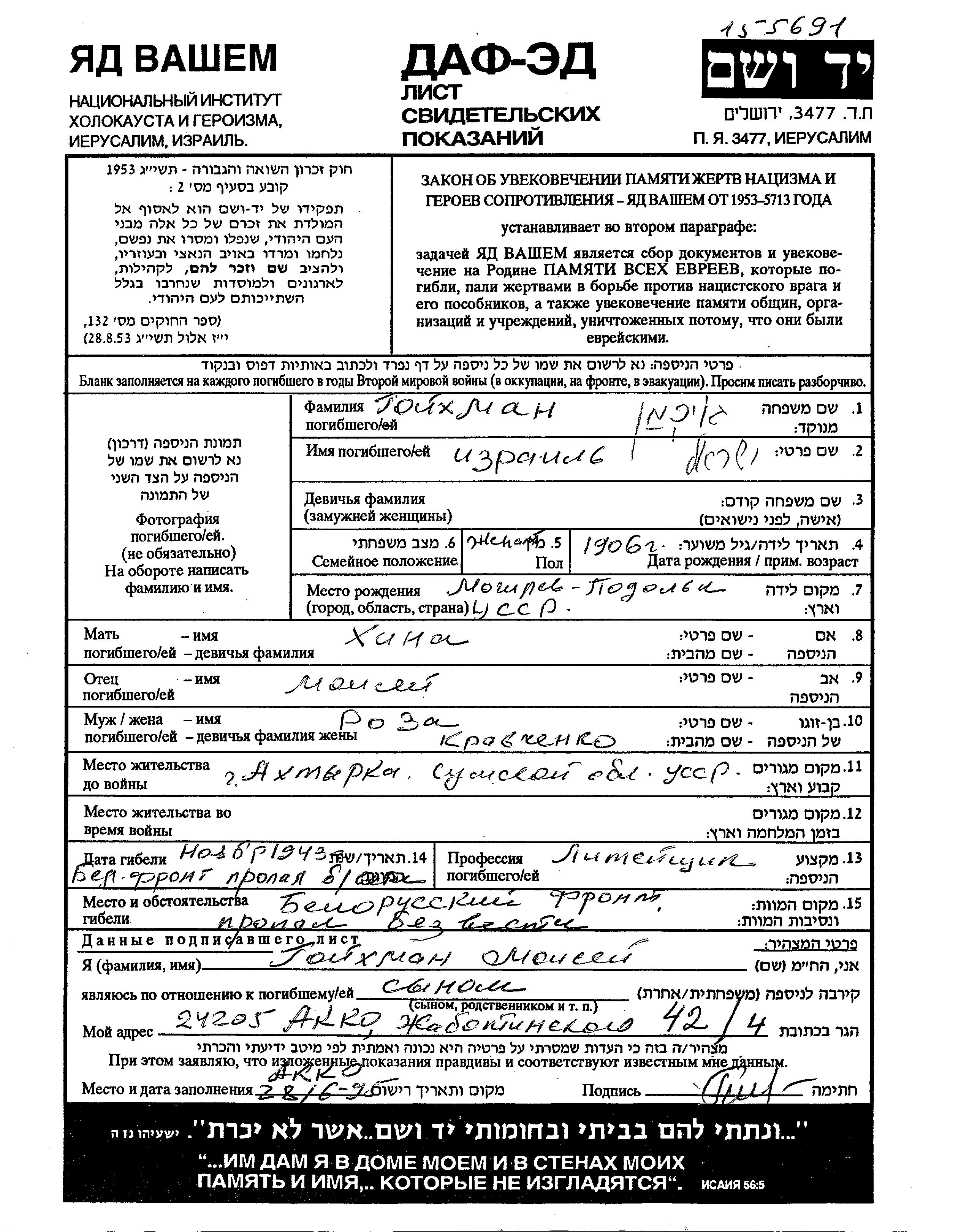 Izrail Goikhman was born in Mogilev Podolski, Ukraine (USSR), 1906 to Moisei and Khana. He was a worker and married to Roza. Prior to WWII he lived in Akhtyrka, Ukraine (USSR). During the war he was in the Soviet armed forces. Izrail was murdered in the Shoah. Place of death: Belorussia (USSR), 1943.