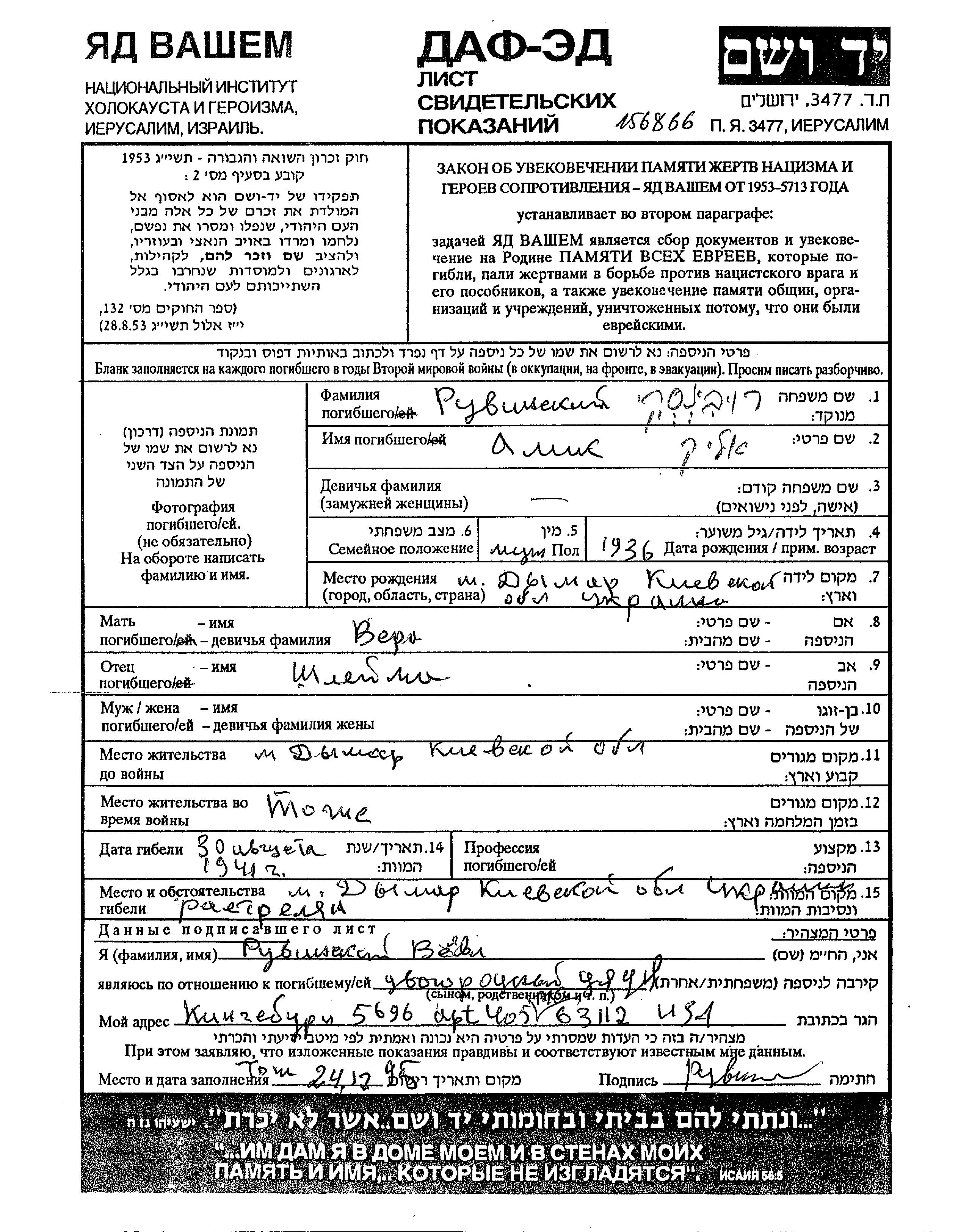 Alik Ruvinski was born in Dymer, Ukraine (USSR), 1936 to Shleima and Vera. He was child. Prior to WWII he lived in Dymer, Ukraine (USSR). During the war he was in Dymer, Ukraine (USSR). Alik was murdered in the Shoah. Place of death: Dymer, Ukraine (USSR), 30/08/1941.