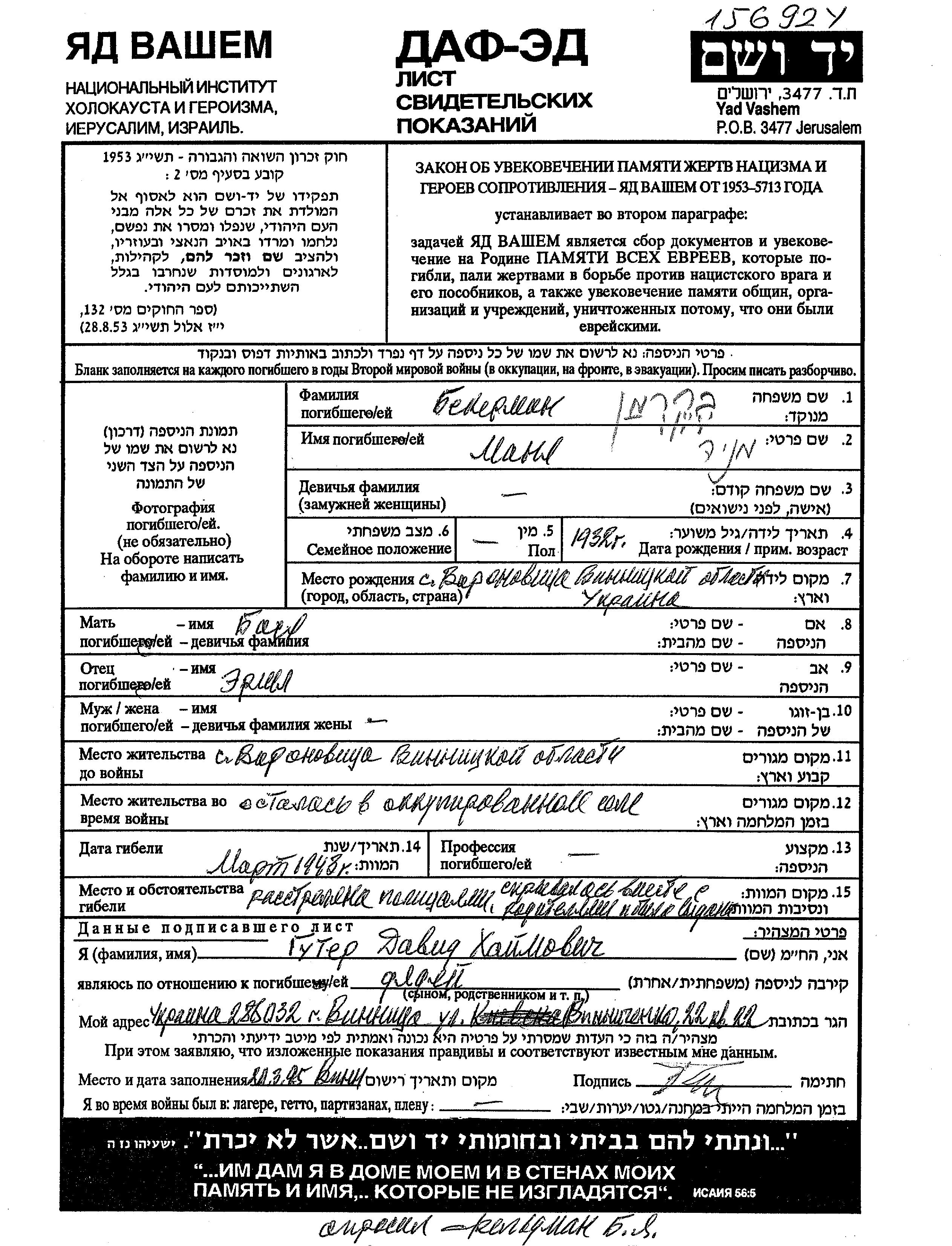 Bekerman Mania 1932 Voronovitsa, Ukraine (USSR) Page of Testimony