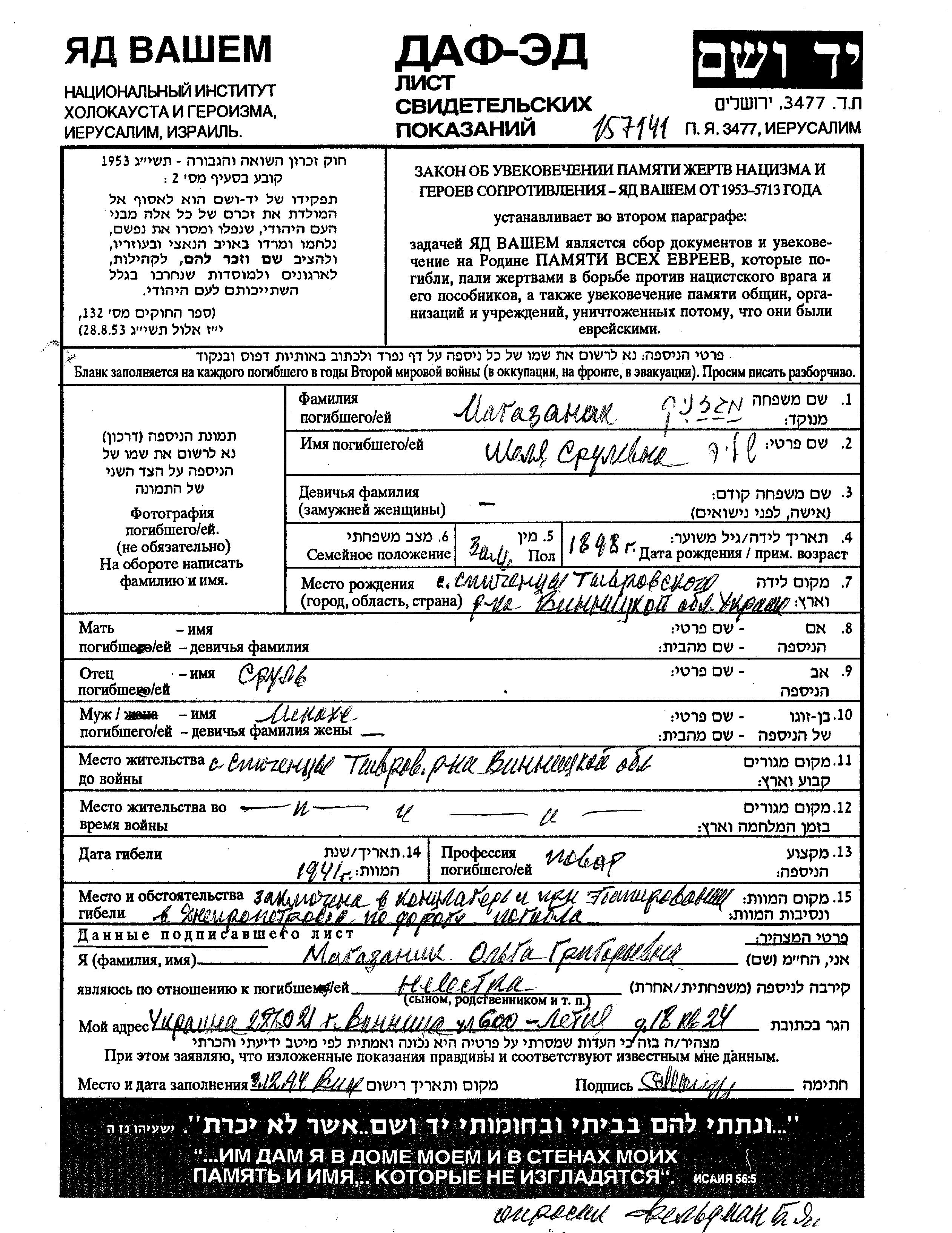 Shelia Shalia Magazanik was born in Spichintsy, Ukraine (USSR), 1898 to Srul. She was a cook and married to Menakhe Menkha. Prior to WWII she lived in Spichintsy, Ukraine (USSR). During the war she was in Spichintsy, Ukraine (USSR). Shelia Shalia was murdered in the Shoah. Place of death: Ukraine (USSR), 1941.