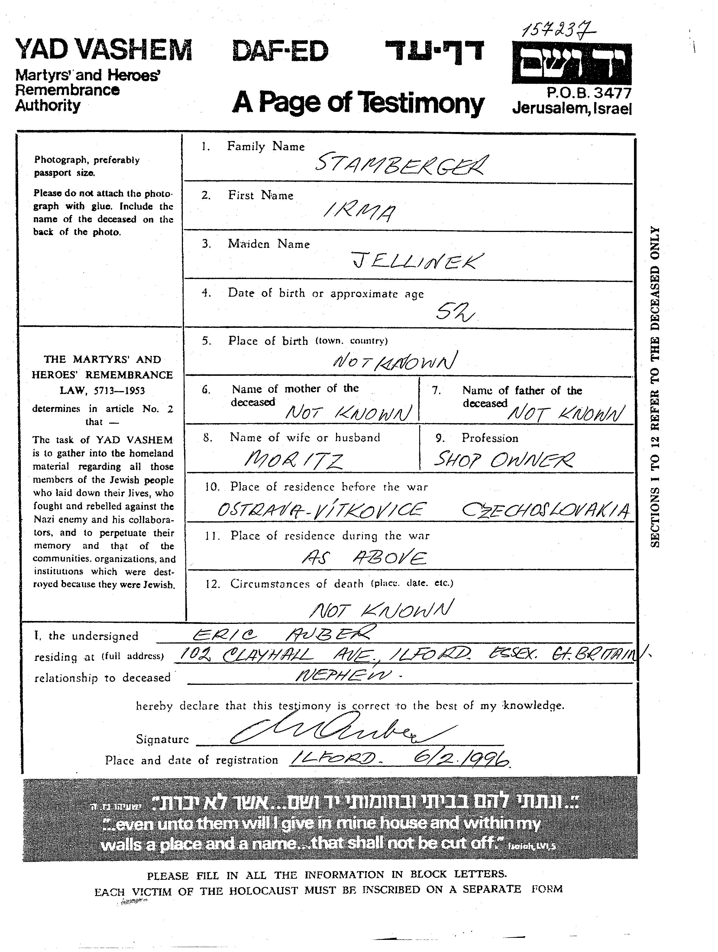 Stamberger Irma Vitkovice, Czechoslovakia Page of Testimony