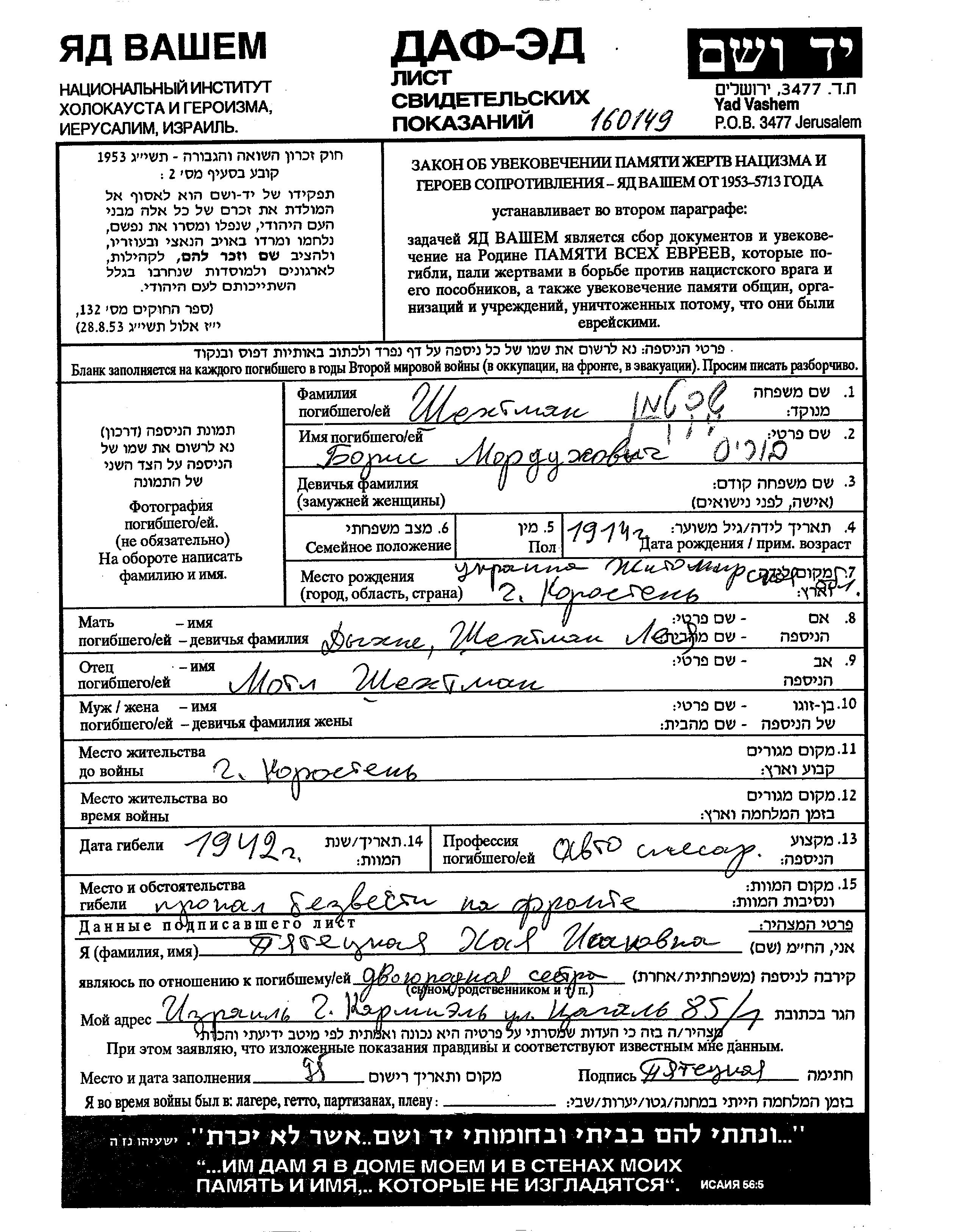 Shekhtman Boris 1914 Korosten, Ukraine (USSR) Page of Testimony