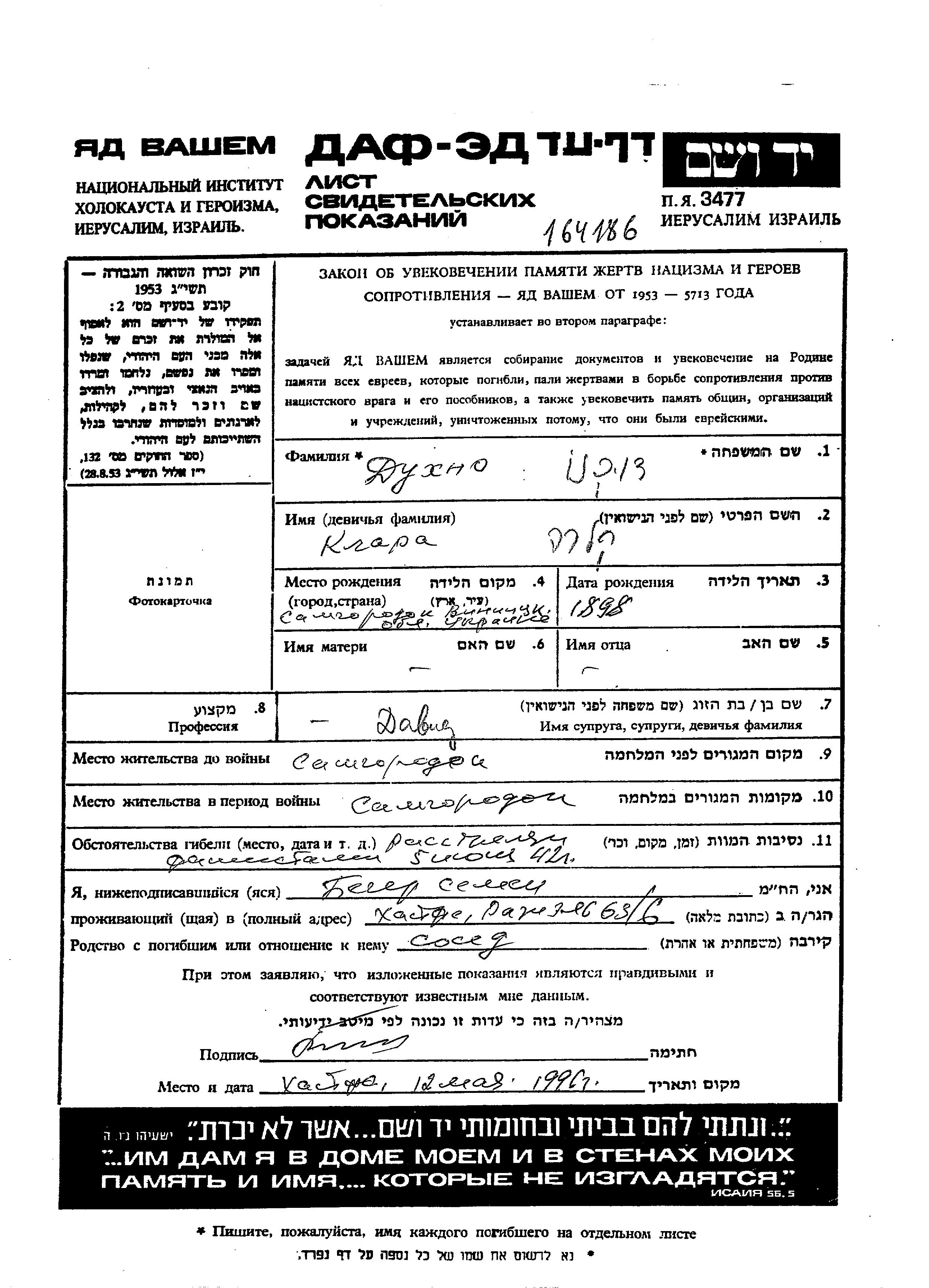 Klara Dukhno was born in Samgorodok, Ukraine (USSR), 1898. She was married to David. Prior to WWII she lived in Samgorodok, Ukraine (USSR). During the war she was in Samgorodok, Ukraine (USSR). Klara was murdered in the Shoah. Place of death: unknown, 05/06/1942.