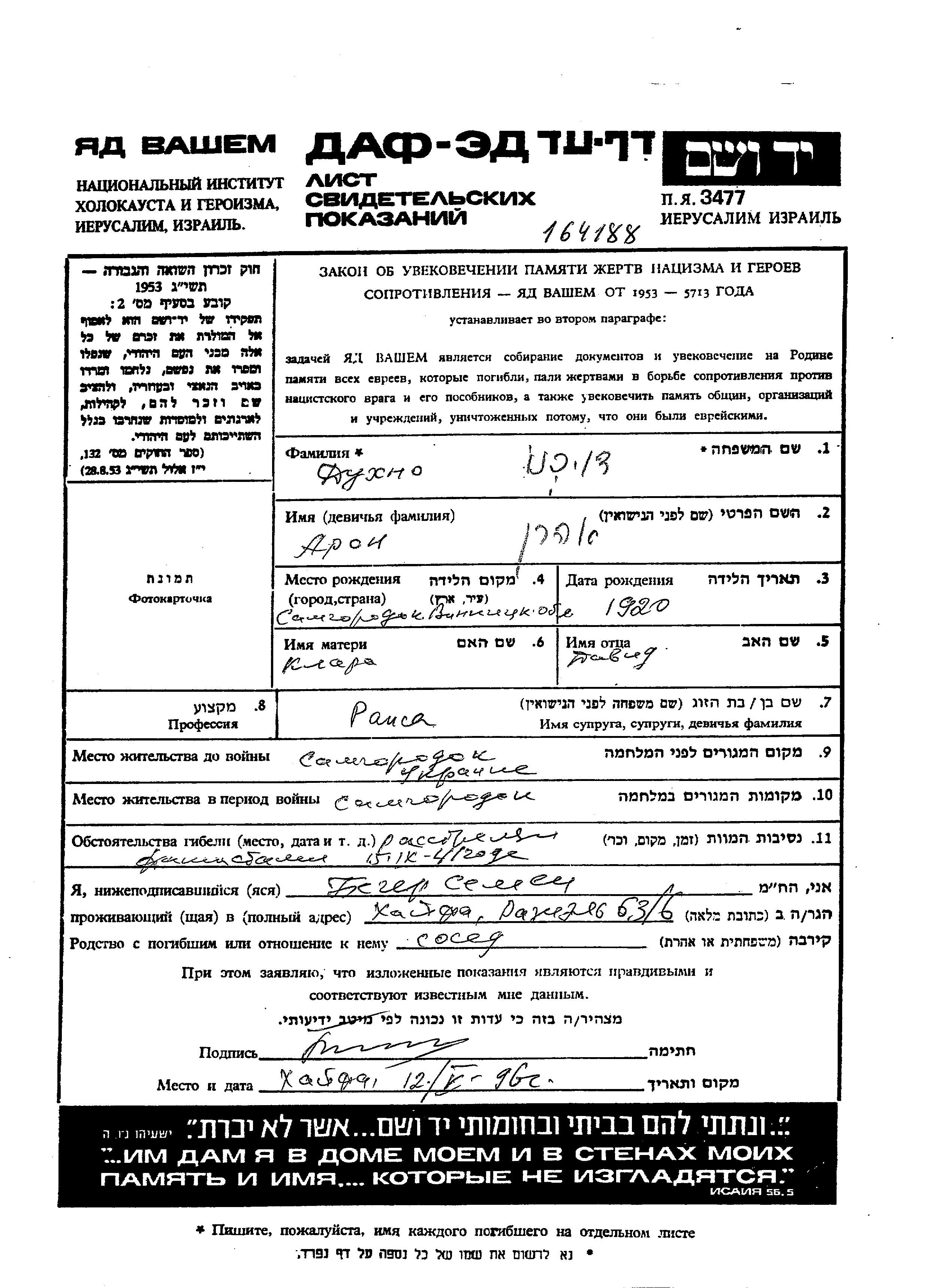 Aron Dukhno was born in Samgorodok, Ukraine (USSR), 1920 to David and Klara. He was married to Raisa. Prior to WWII he lived in Samgorodok, Ukraine (USSR). During the war he was in Samgorodok, Ukraine (USSR). Aron was murdered in the Shoah. Place of death: unknown, 15/09/1941.