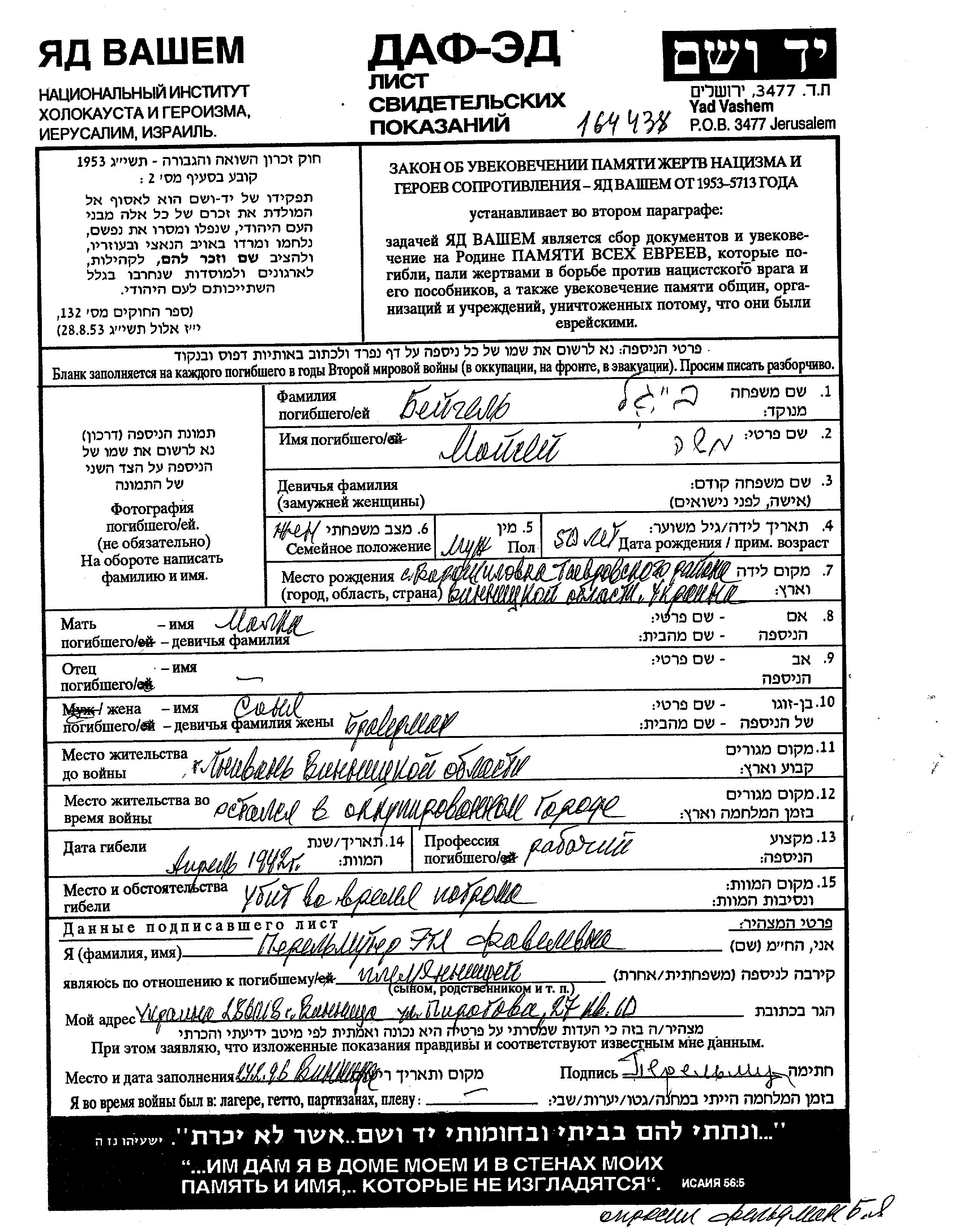Moisei Beigel was born in Voroshilovka, Ukraine (USSR), 1892 to Malka. He was a worker and married to Sonia. Prior to WWII he lived in Gnivan, Ukraine (USSR). During the war he was in Gnivan, Ukraine (USSR). Moisei was murdered in the Shoah. Place of death: unknown, 1942.