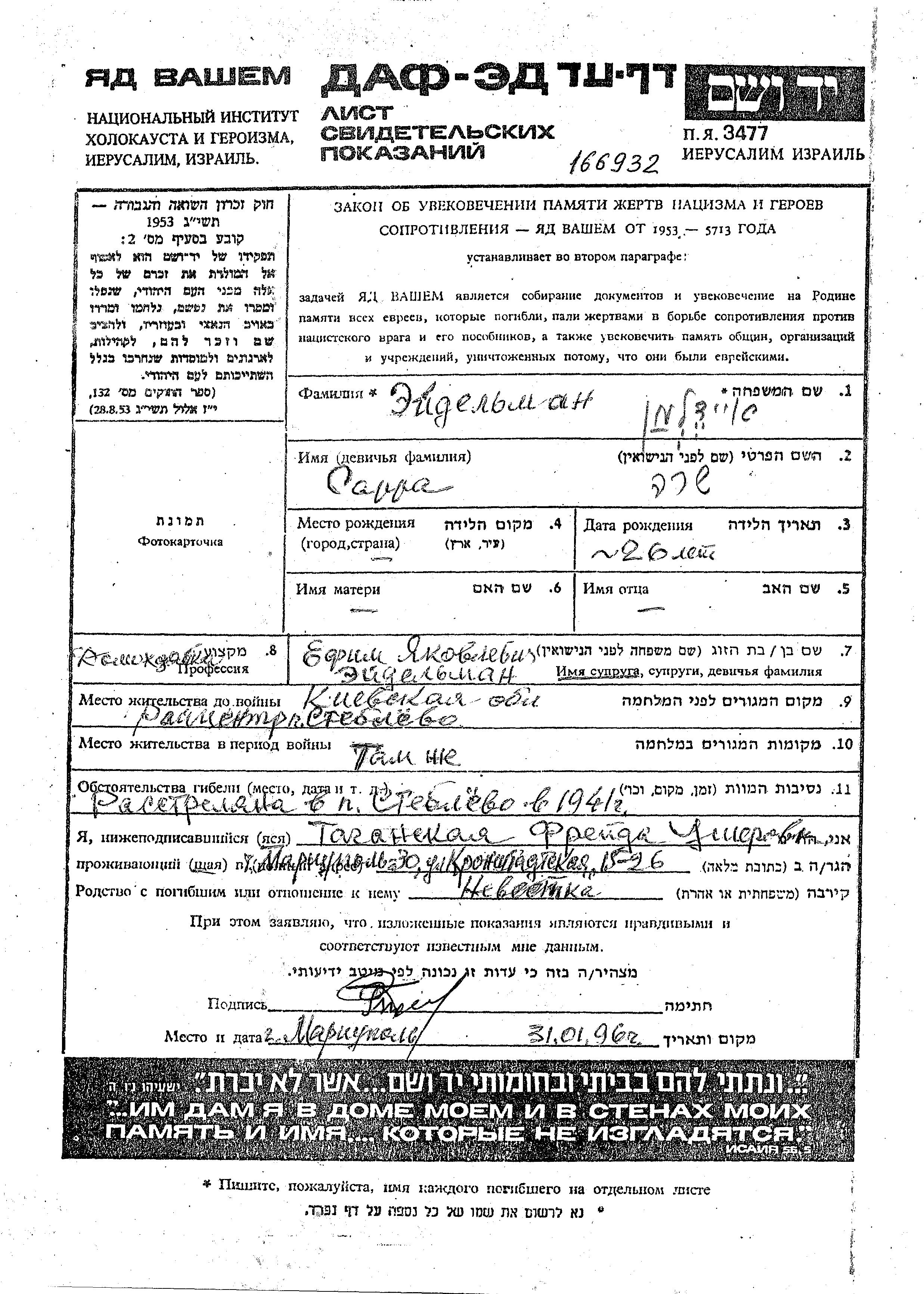 Sara Eidelman was born, 1915. She was a housewife and married to Yefim. Prior to WWII she lived in Steblev, Ukraine (USSR). During the war she was in Steblev, Ukraine (USSR). Sara was murdered in the Shoah. Place of death: Steblev, Ukraine (USSR), 1941.