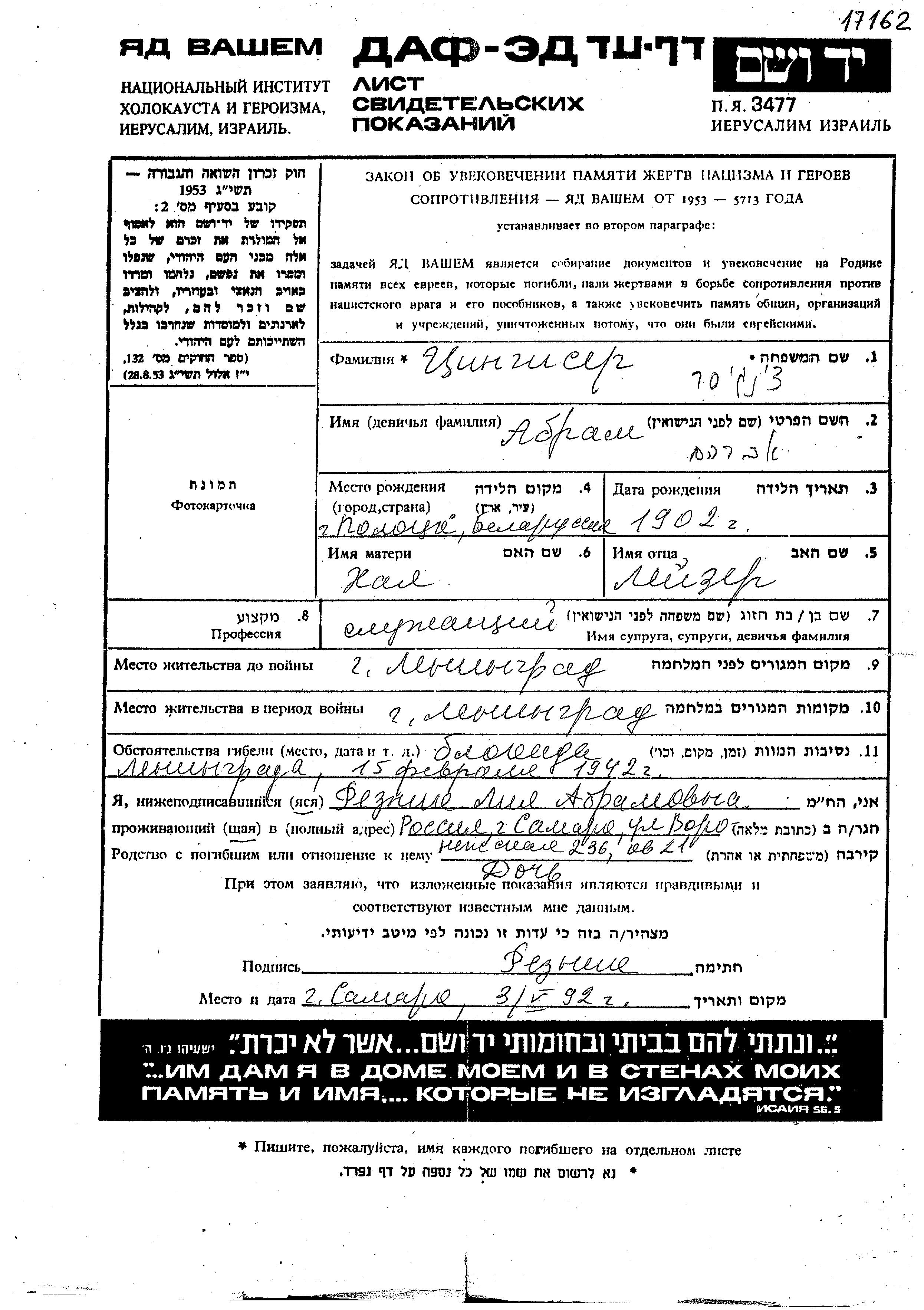 Abram Tzingiser was born in Polotsk, Belorussia (USSR), 1902 to Leizer and Khaia. He was a clerk. Prior to WWII he lived in Leningrad, Russia (USSR). During the war he was in Leningrad, Russia (USSR). Abram perished during the period 1933-1945 in indirect relation with the Shoah. Place of death: Leningrad, Russia (USSR), 15/02/1942.