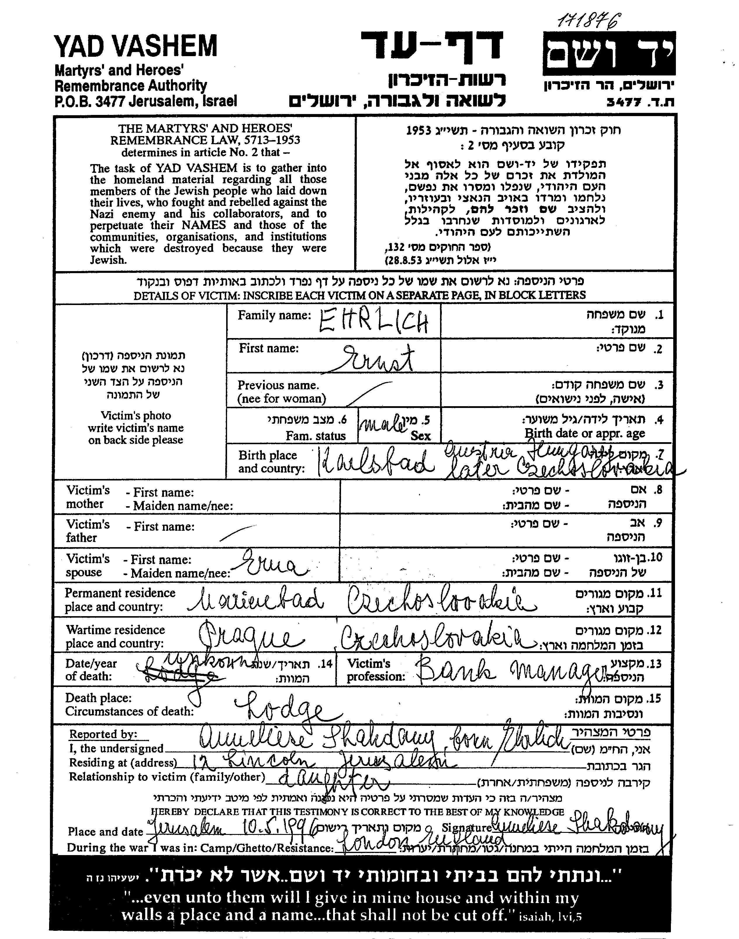 Ehrlich Ernst Marienbad, Czechoslovakia Page of Testimony