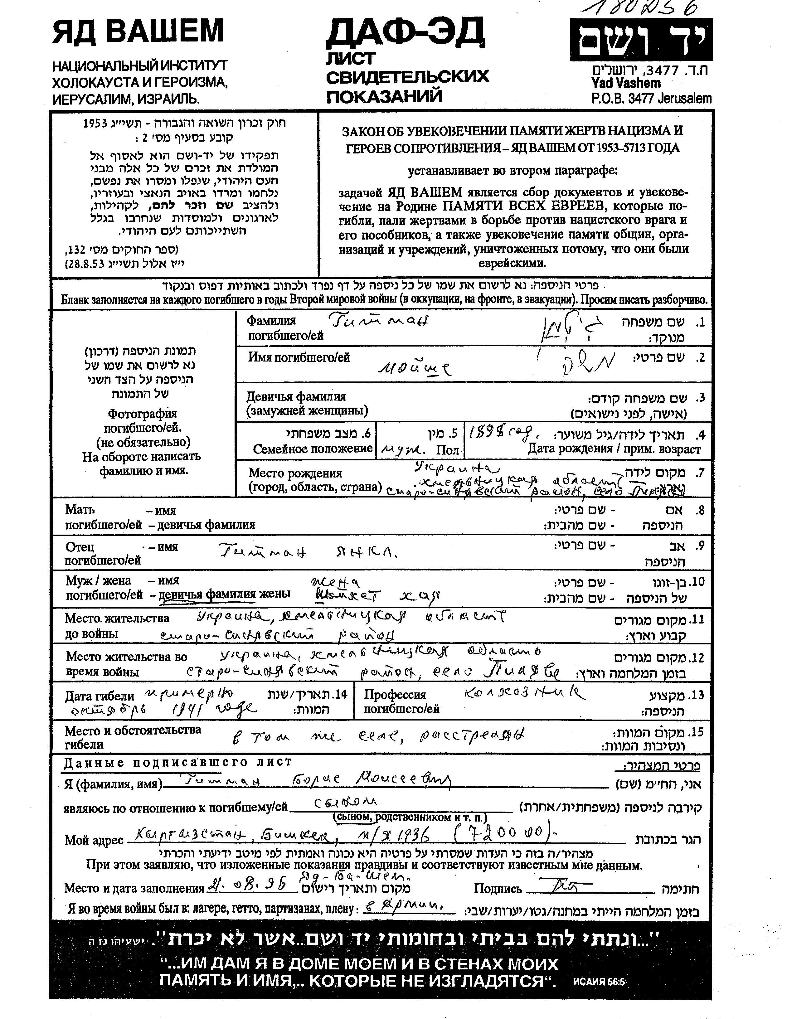 Gitman Moishe 1898 Pilyava, Ukraine (USSR) Page of Testimony