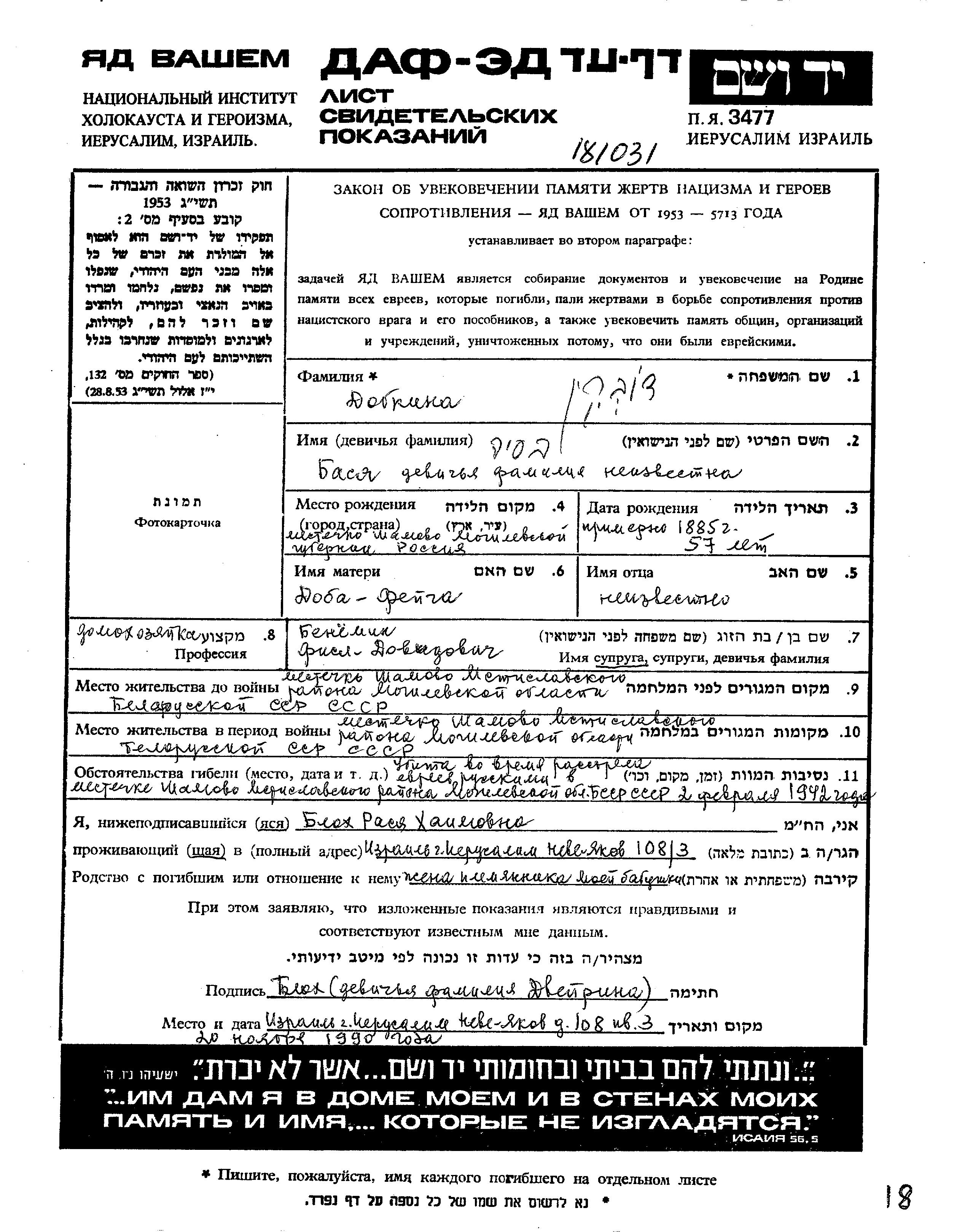 Basya Dobkin was born in Shamovo, Belorussia (USSR), 1885 to Doba Feiga. She was a housewife and married to Benyomin. Prior to WWII she lived in Shamovo, Belorussia (USSR). During the war she was in Shamovo, Belorussia (USSR). Basya was murdered in the Shoah. Place of death: Shamovo, Belorussia (USSR), 02/02/1942.