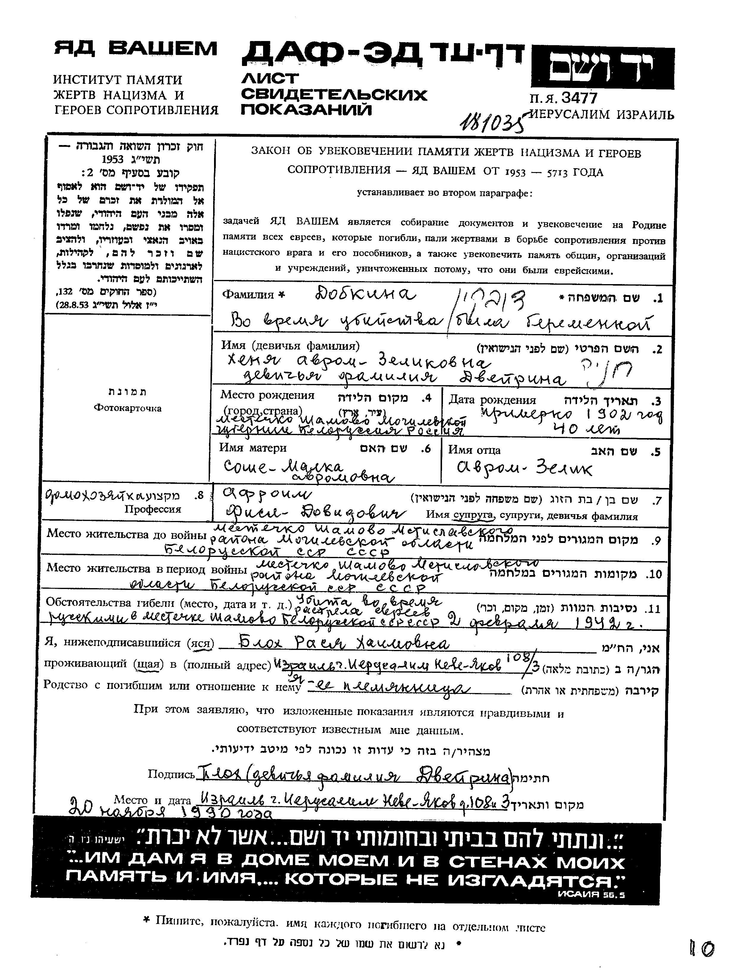 Khenya Dobkin nee Dveirin was born in Shamovo, Belorussia (USSR), 1902 to Avrom Zelik and Soshe Malka. She was a housewife and married to Afroim. Prior to WWII she lived in Shamovo, Belorussia (USSR). During the war she was in Shamovo, Belorussia (USSR). Khenya was murdered in the Shoah. Place of death: Shamovo, Belorussia (USSR), 02/02/1942.