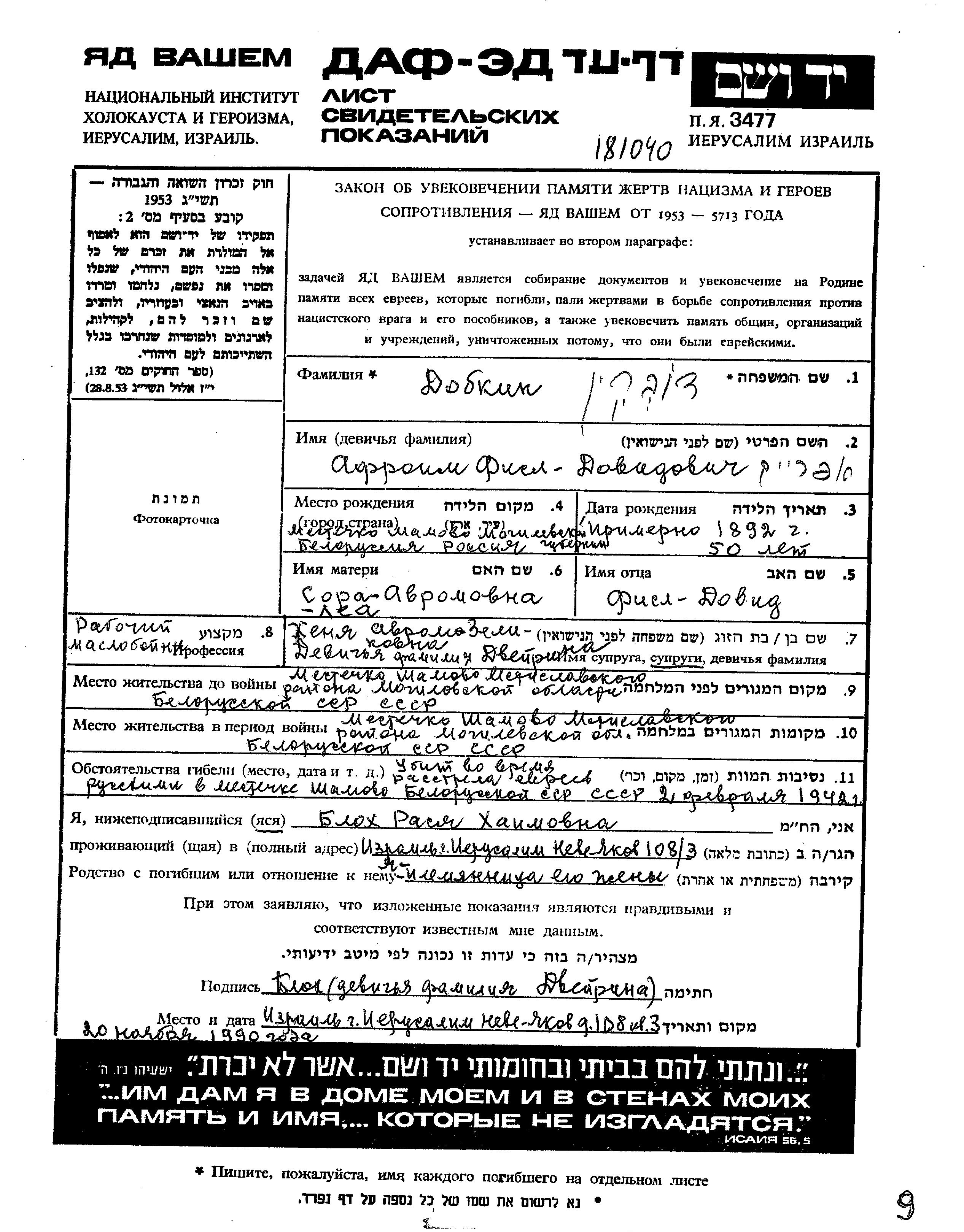Afroim Dobkin was born in Shamovo, Belorussia (USSR), 1892 to Fisl Dovid Pisel and Sora Lea. He was a worker and married to Khenya Khenia. Prior to WWII he lived in Shamovo, Belorussia (USSR). During the war he was in Shamovo, Belorussia (USSR). Afroim was murdered in the Shoah. Place of death: Shamovo, Belorussia (USSR), 02/02/1942.