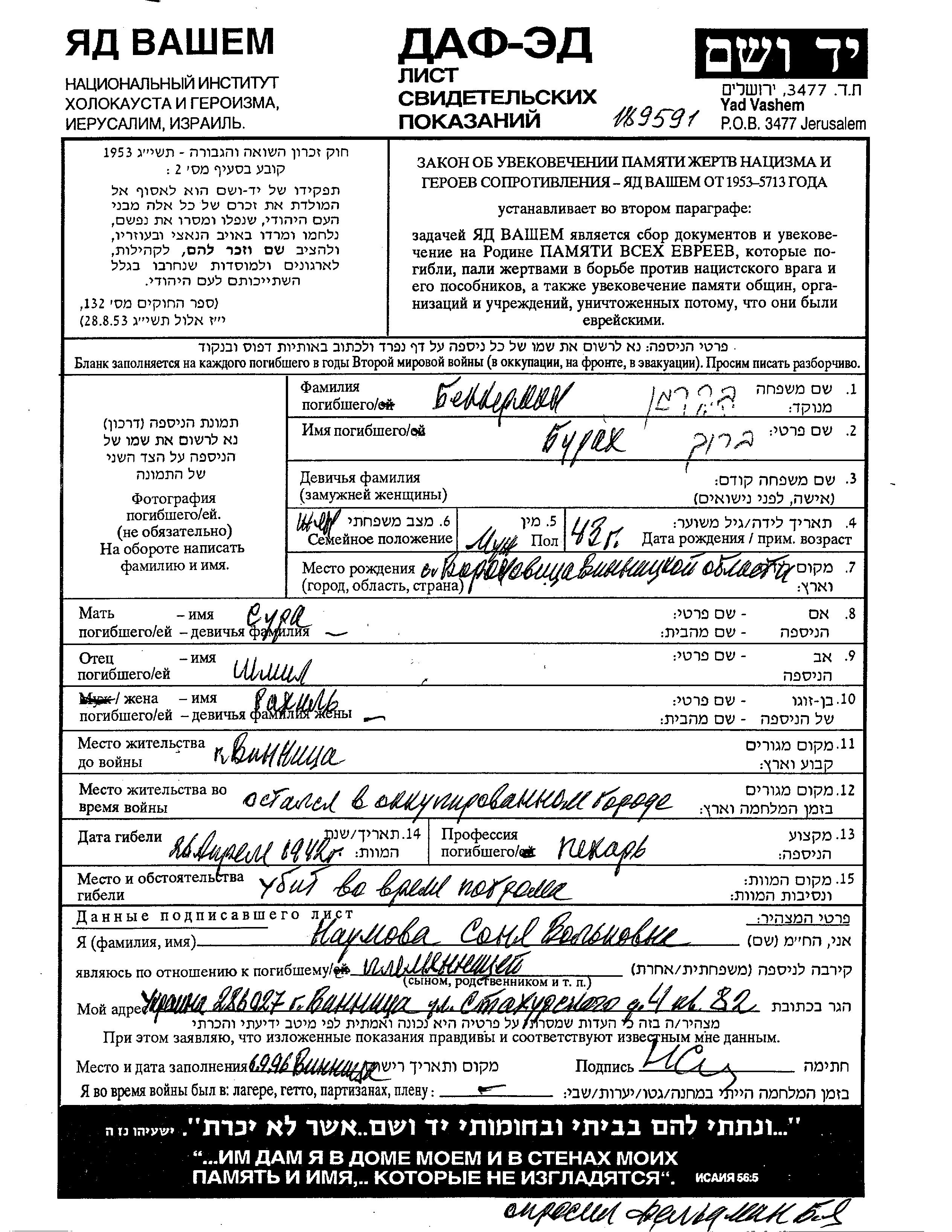 Bekerman Burakh 1899 Voronovitsa, Ukraine (USSR) Page of Testimony