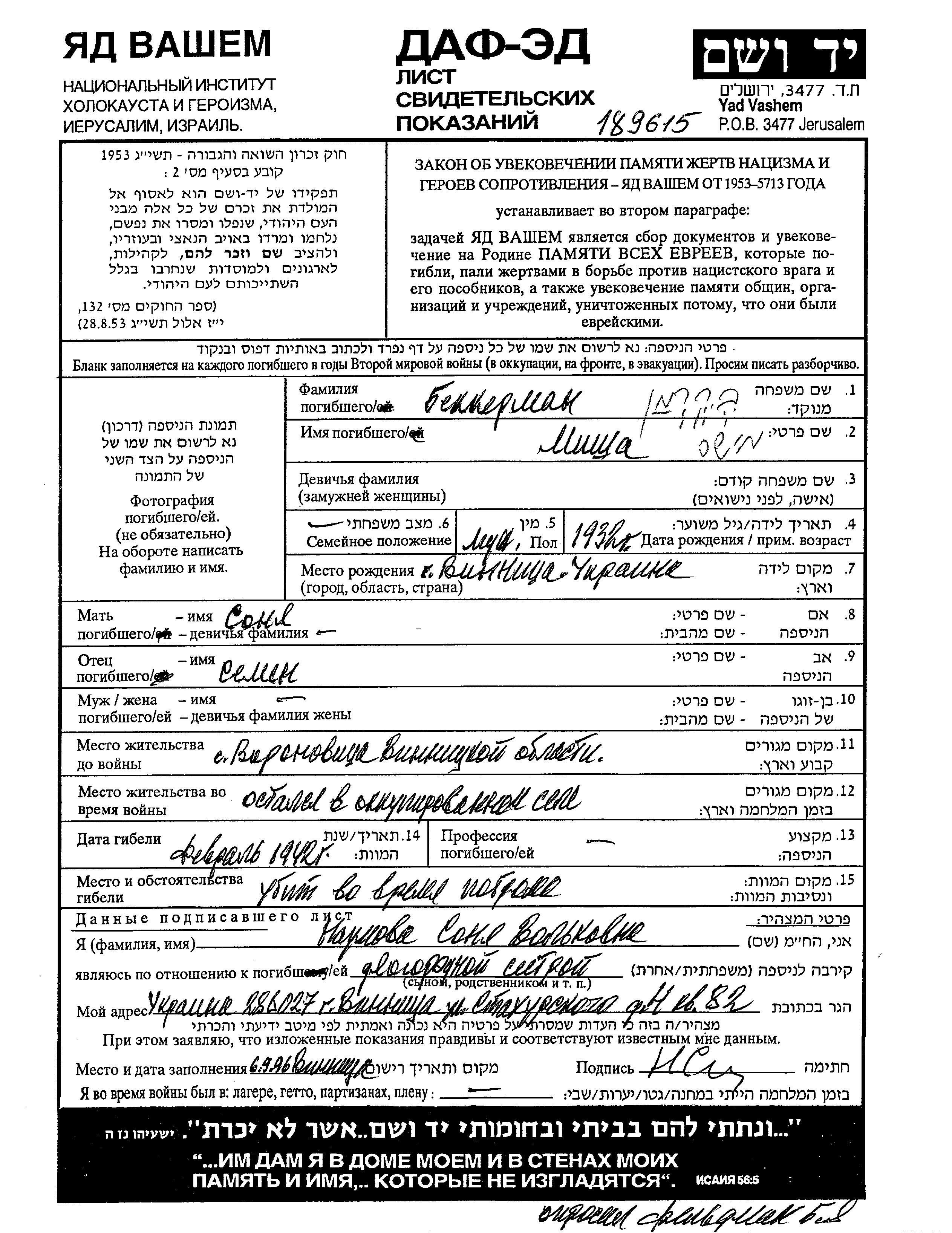Bekerman Misha 1932 Voronovitsa, Ukraine (USSR) Page of Testimony