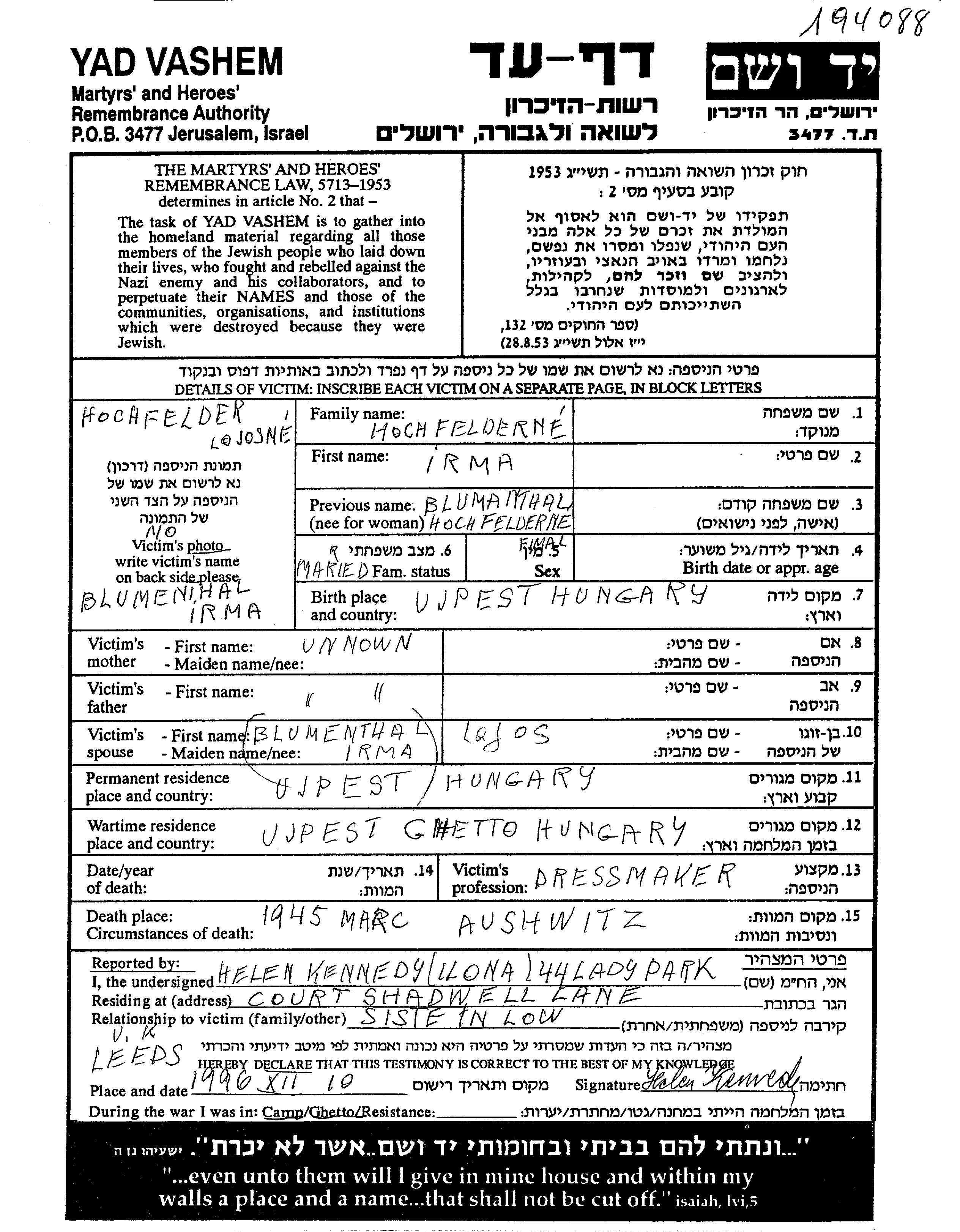 Irma Hochfelder nee Blumenthal was born in Ujpest, Hungary. She was a seamstress and married to Lajos. Prior to WWII she lived in Ujpest, Hungary. During the war she was in Ujpest, Hungary. Irma was murdered in the Shoah. Place of death: Auschwitz, Poland, 1945.