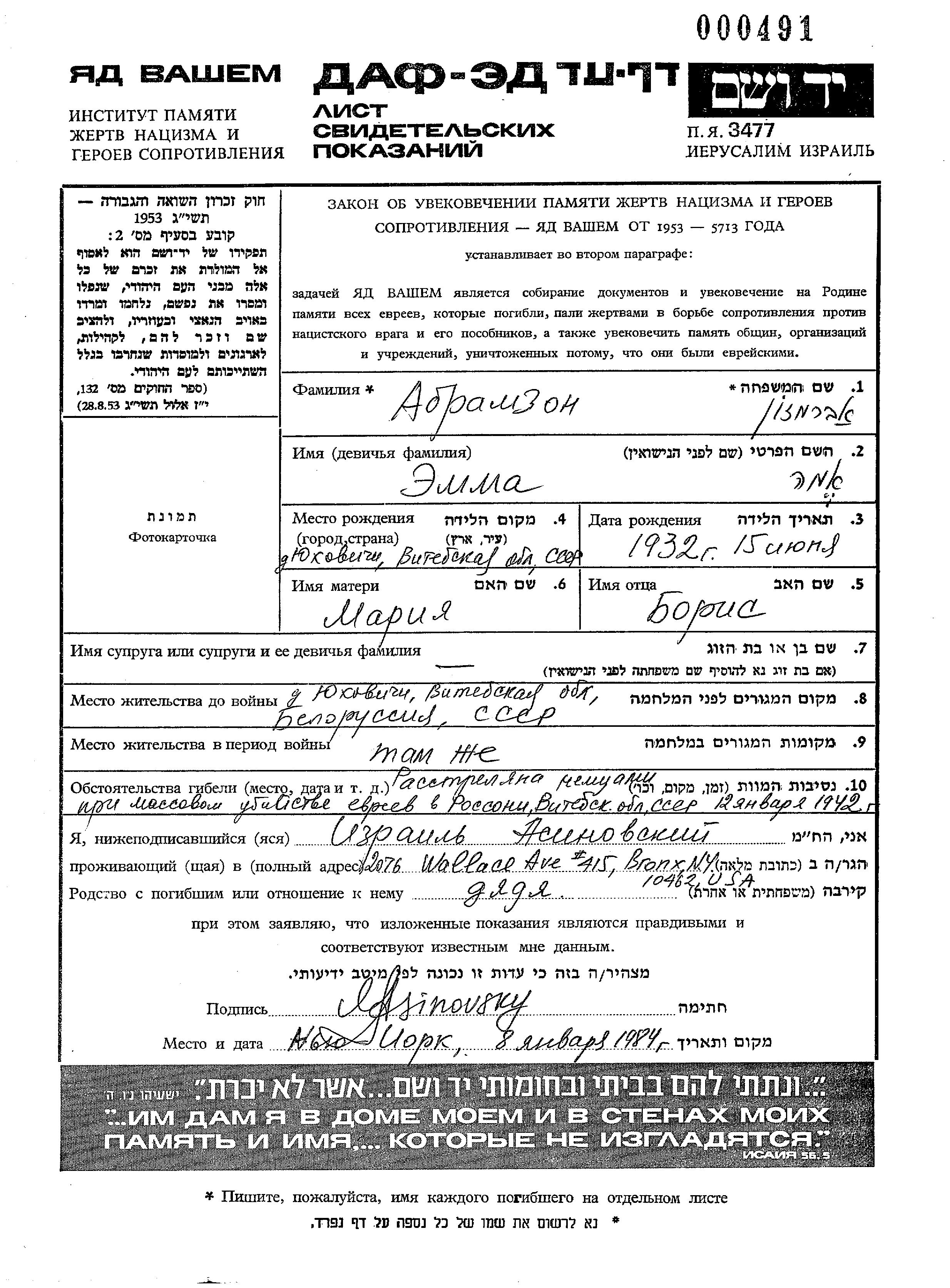 Ema Abramzon was born in Yukhovichi, Belorussia (USSR), 1932 to Boris and Maria nee Asinovski. She was child. Prior to WWII she lived in Yukhovichi, Belorussia (USSR). During the war she was in Yukhovichi, Belorussia (USSR). Ema was murdered in the Shoah. Place of death: Rosony, Belorussia (USSR), 12/01/1942.