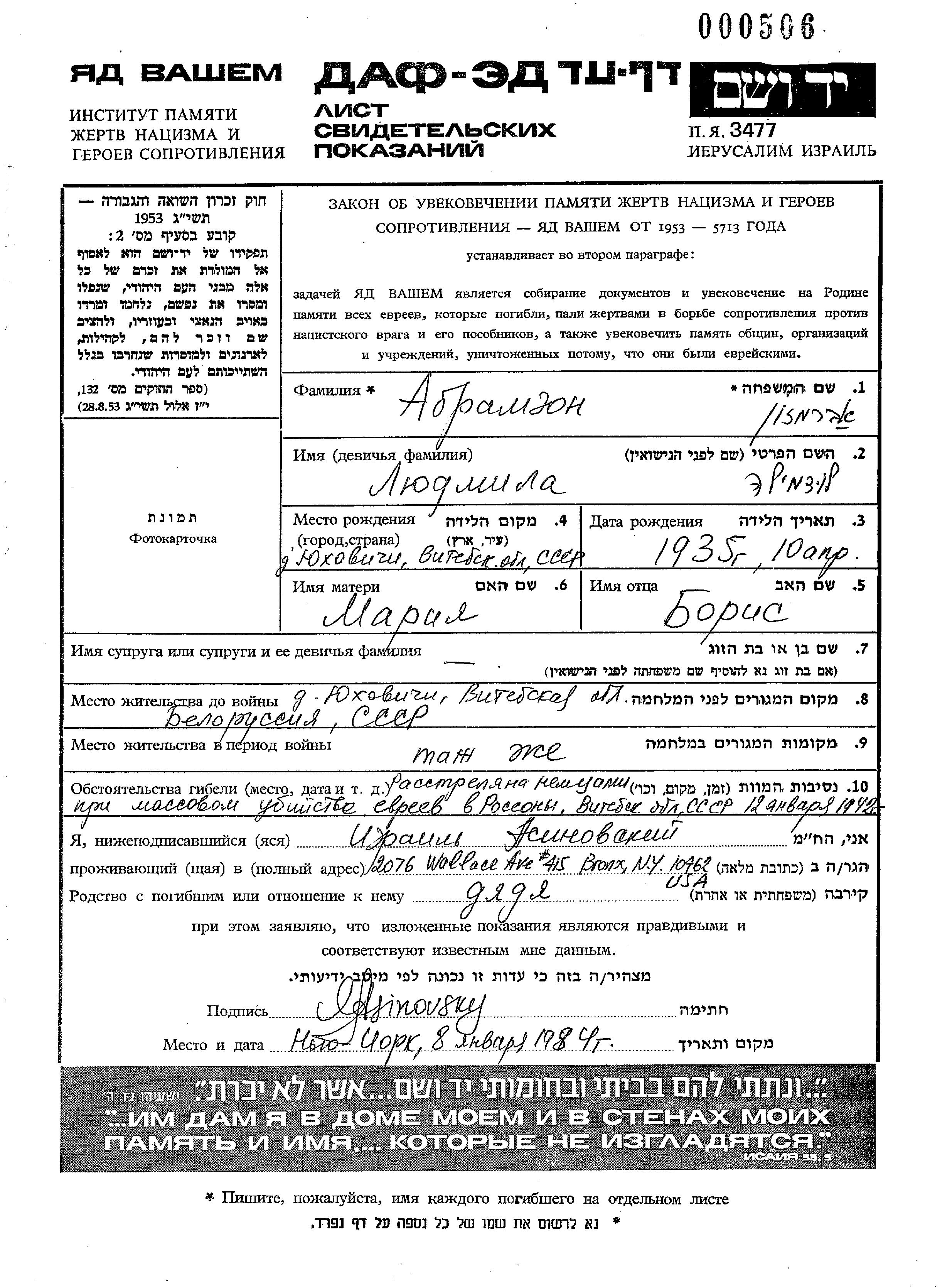 Liudmila Abramzon was born in Yukhovichi, Belorussia (USSR), 1935 to Boris and Maria nee Asinovski. She was child. Prior to WWII she lived in Yukhovichi, Belorussia (USSR). During the war she was in Yukhovichi, Belorussia (USSR). Liudmila was murdered in the Shoah. Place of death: Rosony, Belorussia (USSR), 12/01/1942.